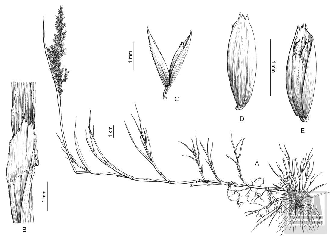 A. Planta. B. Región ligular. C. Espiguilla. D-E. Antecio.