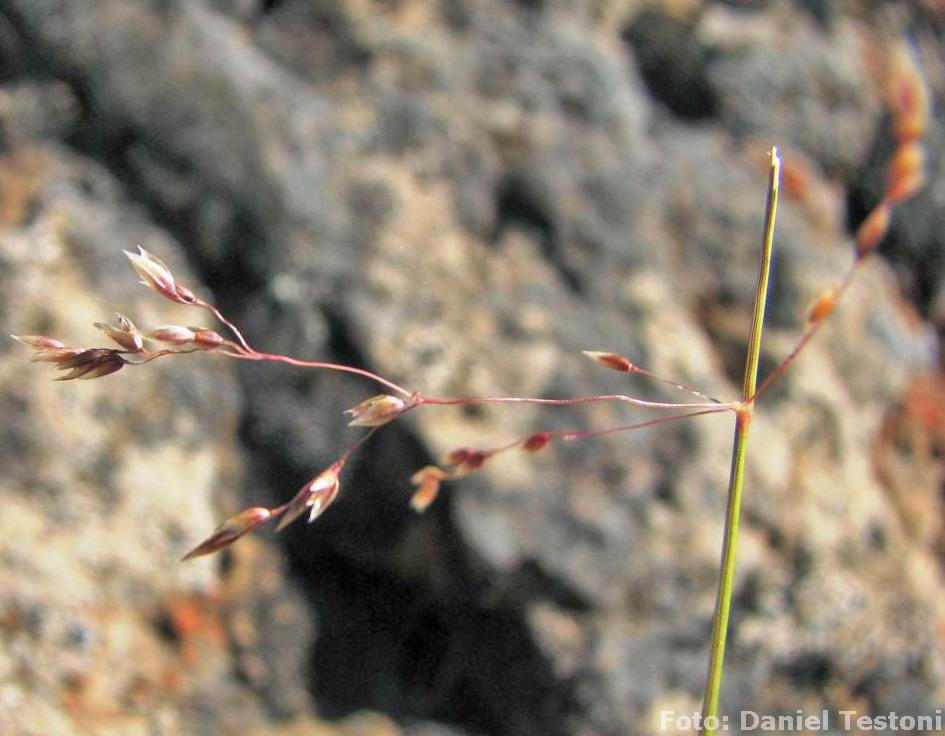 Plantas anuales, cañas delicadas, de 4-40 cm de alto, aisladas o varias juntas, erectas o algo geniculadas, 2-4-nodes, nudos oscuros; lígulas membranáceas, agudas, de 1-6 mm de largo; láminas estrechas a filiformes, de 0,5-5 cm x 0,5 mm, algo escabrosas en el margen y la cara adaxial, glabras en la cara abaxial. Inflorescencia en panoja difusa, grácil, de 2-10 cm de largo, pedicelos escabrosos, con las espiguillas agrupadas en el extremo de los pedicelos. Espiguillas 2-floras, de 2-4 mm de largo, aovadas; glumas subiguales, lanceoladas a anchamente lanceoladas, 1-3-nervias, escabrosas en la quilla, pestañosas en los márgenes; lemmas membranáceas, lanceoladas, dorso redondeado, hialinas hacia el ápice, que es biaristado, escabrósulas, escabrosidad más densa cerca del ápice, violáceas a lo largo del nervio medio, callo con pilosidad rala, pelos cortos 0,5-1 mm de largo, aristadas, arista flexuosa o geniculada, de 2-5 mm de largo, retorcida en la columna y áspera en la súbula, inserta en el tercio medio, algo exsertas; estambres 3, con anteras pequeñas ca. 1 mm de largo, anaranjado-amarillentas; cariopsis aovado, de 1-1,5 mm de largo.