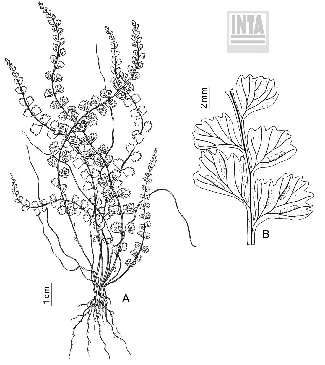 A. Planta. B. Porción de pinna fértil mostrando la venación y la posición de los soros e indusios respectivos.