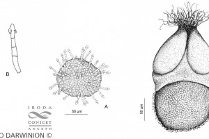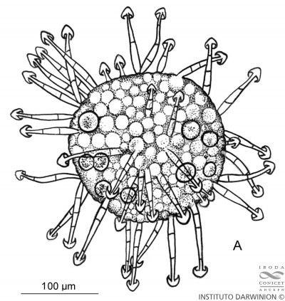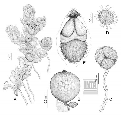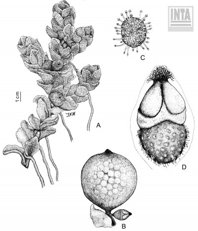 Plantas flotantes hasta de 5 cm de largo; frondes densamente imbricadas, con las hojas verdes a verde-rojizas, elípticas a ovadas, ca. 1 mm de largo, dorsalmente con algunas células epidérmicas alargadas en forma de papilas 1-celulares; microsporangios 35-100 por soro, con microsporas de 13-19 µm de diámetro, con exosporio escabrado, en másulas con gloquidios 0-1-septados; megasporas de 500 × 300 µm, con superficie verrugosa, perisporio ornamentado simulando perforaciones anulares grandes y un collar glabro.