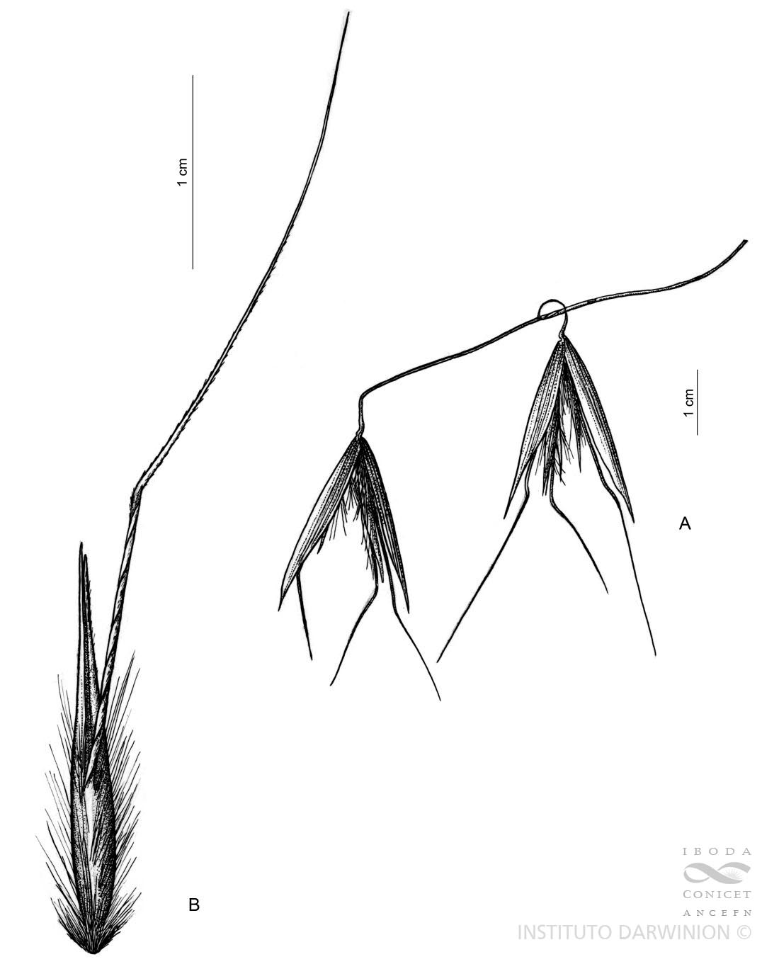 Plantas anuales, erguidas o decumbentes; cañas geniculadas de 30- 150 cm de alto; nudos 3-5; vainas pilosas; lígulas de 2-6 mm de largo, membranáceas; láminas lineares, de 10-45 cm x 3-15 mm, planas, escabrosas. Inflorescencia una panoja piramidal laxa o algo contraída, péndula, de 10-40 cm de largo, ramas primarias péndulas, escabrosas, pedicelos filiformes. Espiguillas solitarias, 2(-3)-floras, péndulas, con la raquilla extendida, cuneadas, comprimidas lateralmente, de 1,8-2,8 cm de largo; antecios articulados, separándose a la madurez; callo evidente, piloso, con pelos cortos que no alcanzan ½ de la lemma, obtuso, desarticulándose oblicuamente; glumas persistentes, subiguales, lanceoladas, de 1,5-2,8 cm de largo, escariosas en la porción apical, membranáceas en la basal, gluma inferior con dorso redondeado, 5-11-nervia, de ápice acuminado; lemma lanceolada, de 1,4-2 cm de largo, coriácea, levemente escariosa en la parte terminal, dorso redondeado, 7-9-nervia, castaño oscuro, glabra o pilosa, ápice 2-4-dentado, dientes irregulares, aristada, arista dorsal geniculada, de 2,5-4 cm de largo, con la columna retorcida; pálea con 2 quillas ciliadas; estambres 3, de 3 mm de largo; cariopsis con pericarpio adherente, de 6-8 mm de largo, hilo linear.