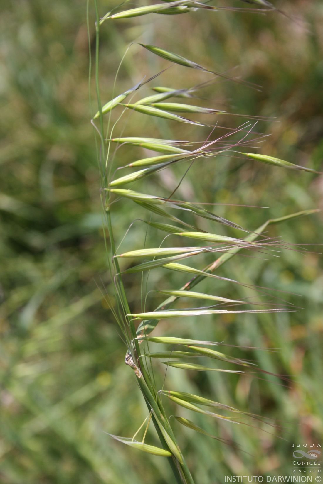 Plantas anuales, erguidas o decumbentes; cañas geniculadas de 30- 150 cm de alto; nudos 3-5; vainas pilosas; lígulas de 2-6 mm de largo, membranáceas; láminas lineares, de 10-45 cm x 3-15 mm, planas, escabrosas. Inflorescencia una panoja piramidal laxa o algo contraída, péndula, de 10-40 cm de largo, ramas primarias péndulas, escabrosas, pedicelos filiformes. Espiguillas solitarias, 2(-3)-floras, péndulas, con la raquilla extendida, cuneadas, comprimidas lateralmente, de 1,8-2,8 cm de largo; antecios articulados, separándose a la madurez; callo evidente, piloso, con pelos cortos que no alcanzan ½ de la lemma, obtuso, desarticulándose oblicuamente; glumas persistentes, subiguales, lanceoladas, de 1,5-2,8 cm de largo, escariosas en la porción apical, membranáceas en la basal, gluma inferior con dorso redondeado, 5-11-nervia, de ápice acuminado; lemma lanceolada, de 1,4-2 cm de largo, coriácea, levemente escariosa en la parte terminal, dorso redondeado, 7-9-nervia, castaño oscuro, glabra o pilosa, ápice 2-4-dentado, dientes irregulares, aristada, arista dorsal geniculada, de 2,5-4 cm de largo, con la columna retorcida; pálea con 2 quillas ciliadas; estambres 3, de 3 mm de largo; cariopsis con pericarpio adherente, de 6-8 mm de largo, hilo linear.