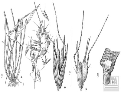 Plantas anuales; cañas erectas, gráciles, de 1,2-1,5 m de alto, simples; nudos 2-6; vainas glabras de 12-14 cm de largo; lígulas triangulares, de 4-5 mm de largo, membranáceas; láminas glabras, de 15-20 cm x 5-10 mm. Inflorescencia una panoja abierta, raramente algo contraída, piramidal, nutante, de 8-30 cm de largo, ramas nutantes; pedúnculos filiformes. Espiguillas nutantes, (1)-2-3-floras, solitarias, con la raquilla prolongada, cuneadas, comprimidas, de 1,5-2 cm de largo; callo glabro, desarticulándose oblicuamente; glumas subiguales, lanceoladas, de 1,5- 2 cm de largo, 7-9-nervias, persistentes, ápice acuminado, membranáceas, dorso redondeado; lemma del antecio basal lanceolada, de 1-1,5 cm de largo, biaristulada, arístulas ca. 6 mm de largo, lustrosas, redondeadas, glabras o apenas pubescentes cerca del ápice, arista dorsal, insertada en 1/3 superior, geniculada, largamente exerta, de 2-3,5 cm de largo, con la columna retorcida, de color castaño oscuro, aristas laterales mas cortas; pálea con quillas cilioladas; estambres 3, de 2,5-4 mm de largo; cariopsis con pericarpio adherente, pubescente.