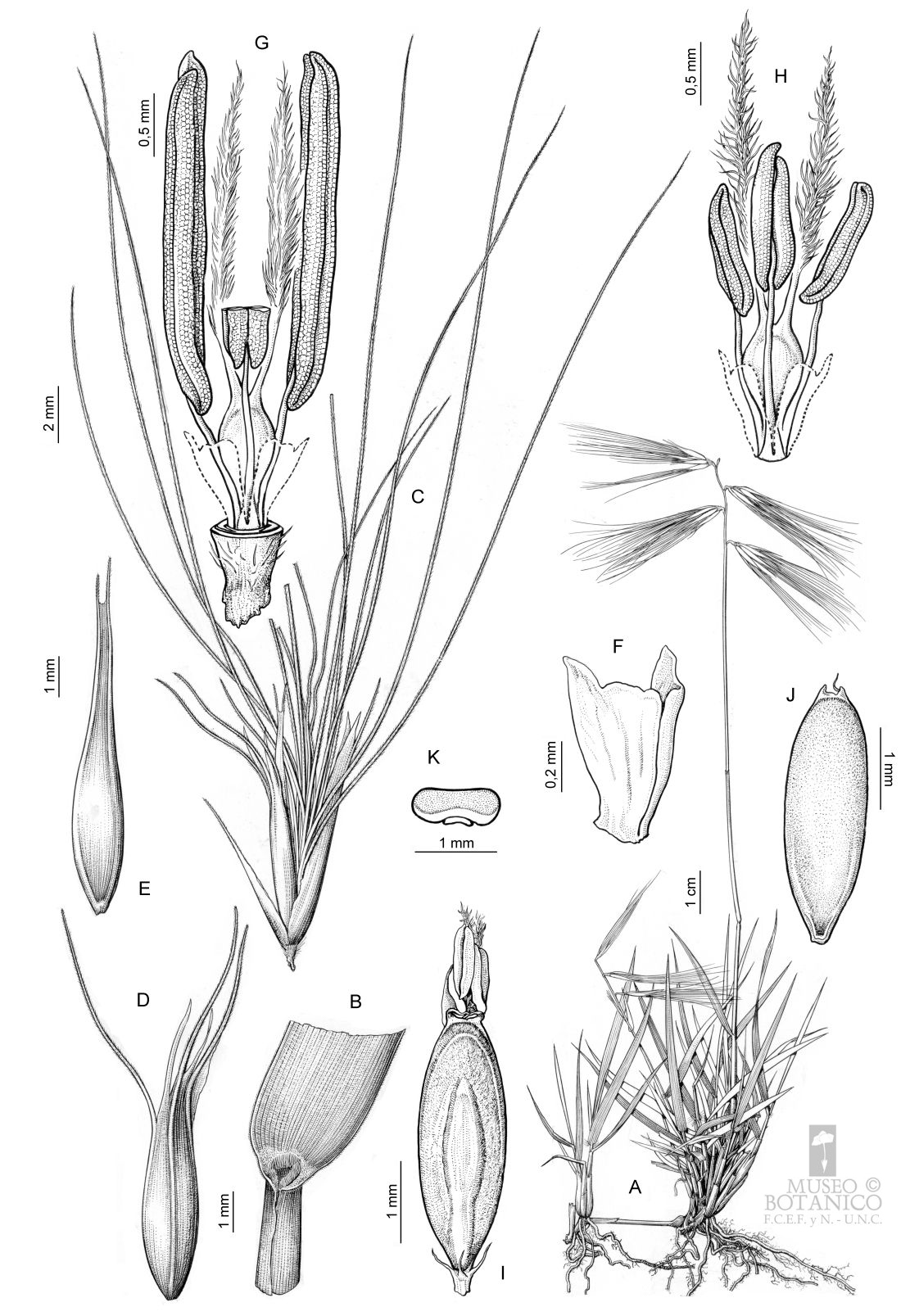 A. Planta. B. Región ligular. C. Espiguilla, gluma inferior y antecio fértil a la izquierda. D. Lemma del antecio basal fértil, vista dorsal. E. Pálea del antecio basal, vista dorsal. F. Lodículas, vista lateral. G. Flor casmógama (lodículas indicadas, porción del estambre frontal seccionado). H. Flor cleistógama (lodículas indicadas). I. Cariopsis, vista escutelar. J. Cariopsis, vista hilar. K. Cariopsis, transcorte.