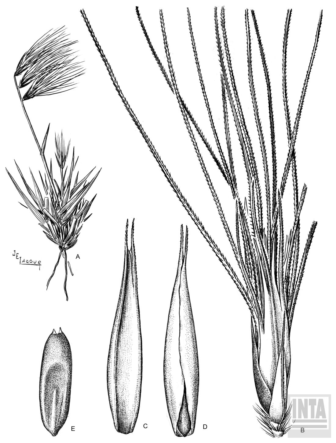 Plantas perennes, estoloníferas; cañas de 15-25 cm de alto, ascendentes, con hojas basales; vainas glabras; lígulas ciliadas, de 0,4 mm de largo; láminas de 3-10 cm x 2-3 mm, ralamente pilosas, planas a involutas, firmes, angostas y de ápice acuminado. Inflorescencias de 10-15 cm de largo, con 2-6 espigas de 2,5-3,5 cm de largo, erectas o ascendentes, deciduas a la madurez, cada espiga con 3-10 espiguillas congestas; raquis aplanado, lanoso, terminando en 2 aristas iguales o desiguales de 8-10 mm de largo. Espiguillas de 9-12 mm de largo, persistentes en los racimos; glumas desiguales, 1-nervias, glabras; gluma inferior de 5-6 mm de largo, angosta, reducida, setácea o gradualmente adelgazándose hacia una arista, escabriúscula a glabra; gluma superior de 8-11 mm de largo, más ancha que la inferior, 1-3-aristada, con un nervio medio robusto y escabriúsculo; lemma de la flor perfecta de 9-12 mm de largo (incluidas las aristas), lisa, brillante, 3-aristada, las aristas desiguales, la terminal de 2-3 mm de largo, más larga y más robusta que las laterales, usualmente con 2 setas delgadas en la base; pálea de 8-9 mm de largo, 2-aristada; flores rudimentarias 2-4, densamente congestas, reducidas a 3 aristas de 2-3 cm de largo, con 2 setas membranáceas en la base; cariopsis cilíndrica-obovada, de 2-2,5 mm de largo.
