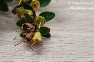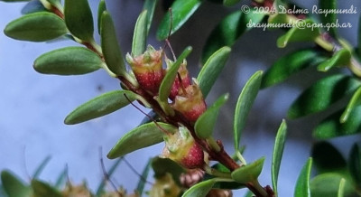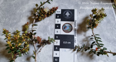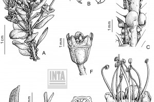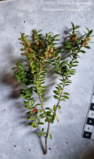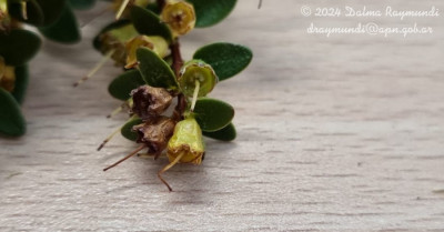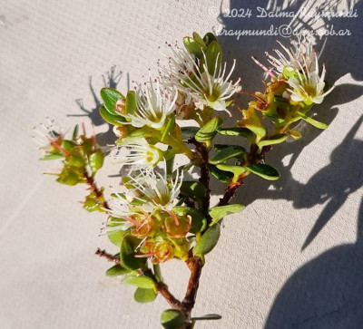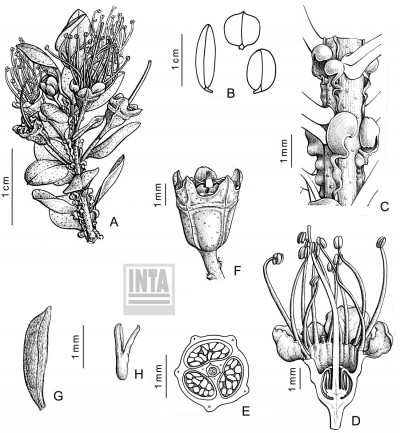 Arbusto o árbol de 2-8 m alt. Hojas de 4-10 x 3-4,5 mm, con lámina coriácea, algo discolora, con glándulas conspicuas sobre la cara superior, ovada a oblongo-lanceolada, generalmente obtusa; pecíolo de 1-2 mm, glabro. Pedúnculos florales de 5-10 mm, suavemente pubescentes. Hipanto de ca. 2 mm, glabro. Sépalos de 1-1,5 mm, glabros, subdeltoides. Pétalos de 2-3 mm, suborbiculares. Estambres 16-24, de 5-7 mm; disco estaminal glabro. Estilo de 7-10 mm, ginobásico. "Diplotegia acampanada, tricarpelar, trilocular, de placentación axilar-basal y con semillas erectas. Tiene 4-5 mm diám. y 5-6 mm, color castaño-grisáceo o rojizo, glándulas oleíferas bien visibles y con los 5 sépalos y el estilo ginobásico, persistentes"... "En los casos, bastante frecuentes, en que las cápsulas vacías permanecen un tiempo prolongado sobre la planta, comienza a producirse la desintegración de los tejidos blandos que se hallan entre las costillas y el reborde del cáliz, formándose en consecuencia 5 orificios trasversales, uno entre cada costilla" (Movia, 1964). Semillas de 2 mm, 7-9 por lóculo, con tegumento tenue, a veces con pequeñas líneas trasversales oscuras.