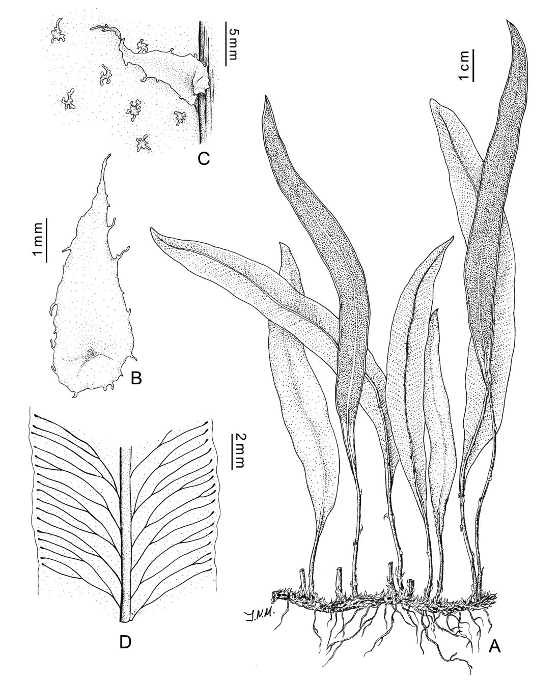 A. Planta. B. Escama rizomática. C. Escamas del envés de la lámina y sobre la nervadura media. D. Detalle de la lámina, cara abaxial, mostrando la venación.