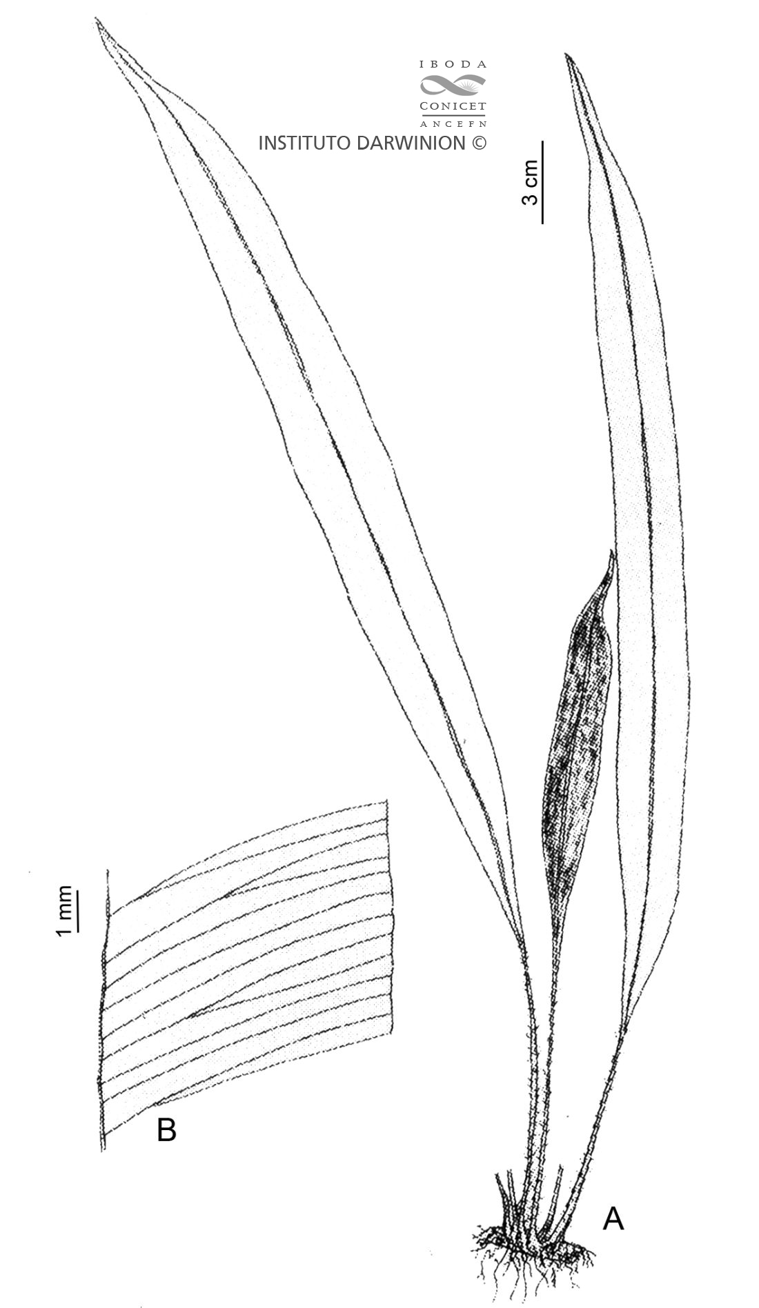 A. Planta (la fronde fértil sombreada). B. Detalle de la venación.
