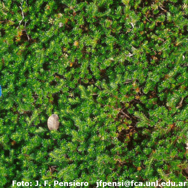 Hierbas compactas, cespitosas. Tallos rastreros, radiales, con rizóforos axilares, ramas pinnadas, de 1-1,5 mm de diámetro (incluyendo los licofilos), levemente involutas en estado durmiente. Licofilos isomorfos, verde pálidos, de 2-3 × 0,3-0,5 mm, lineares, subulados, angostamente atenuados, márgenes serrulados o ciliados, adnatos, setosos, con una arista apical hasta 1/4 del largo de la lámina, de disposición espiralada. Estróbilos tetrágonos, de 3- 8 mm de largo en los extremos de ramas laterales. Esporofilos de 1,5 × 0,7 mm, ovado-lanceolados, acuminados a aristados.