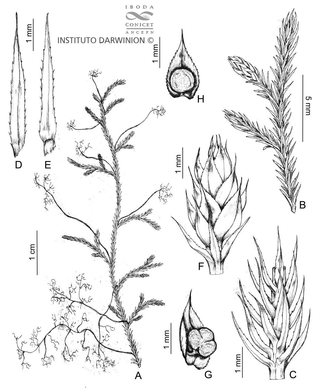 Hierbas compactas, cespitosas. Tallos rastreros, radiales, con rizóforos axilares, ramas pinnadas, de 1-1,5 mm de diámetro (incluyendo los licofilos), levemente involutas en estado durmiente. Licofilos isomorfos, verde pálidos, de 2-3 × 0,3-0,5 mm, lineares, subulados, angostamente atenuados, márgenes serrulados o ciliados, adnatos, setosos, con una arista apical hasta 1/4 del largo de la lámina, de disposición espiralada. Estróbilos tetrágonos, de 3- 8 mm de largo en los extremos de ramas laterales. Esporofilos de 1,5 × 0,7 mm, ovado-lanceolados, acuminados a aristados.
