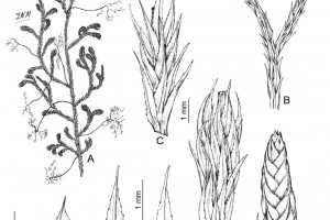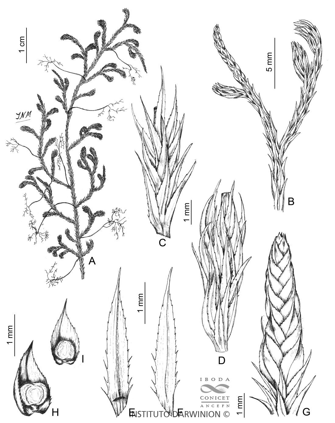 A. Planta. B. Ápice de una rama, con estróbilo y ápices durmientes. C-D. Detalle de una rama, vistas dorsal y ventral respectivamente. E-F. Licofilo, vistas ventral y dorsal respectivamente. G. Estróbilo. H. Macrosporofilo. I. Microsporofilo.