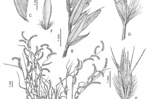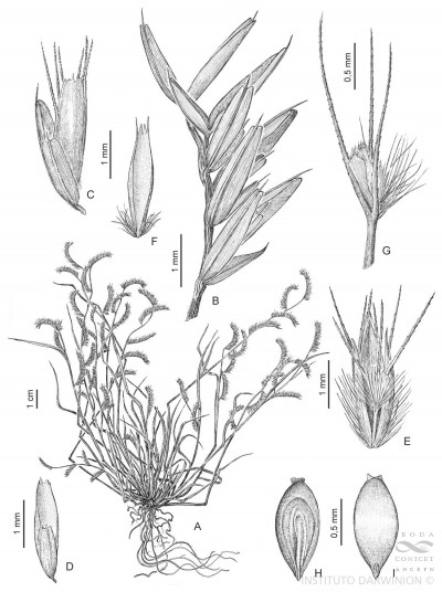 Plantas anuales, de tamaño y aspecto variable; cañas de 5-30(-50) cm de largo, erectas o decumbentes, nunca desarrollando estolones, entrenudos glabros; hojas persistentes, basales; vainas de 1-5 cm de largo, con el margen membranáceo-hialino; lígulas de 0,6-1 mm de largo, con pelos hialinos cortos y largos; láminas de 1-9 cm x 1-3 mm, rectas, planas, de ápice acuminado, escabrosas en la cara adaxial, con pelos papilosos a los lados del nervio medio y a veces en los nervios laterales, la cara abaxial escabrosa, a veces con pelos papilosos. Inflorescencias con (2-)7 (-11) espigas de 1-2,5 cm x 1,5-5 mm, unilaterales, persistentes, ligeramente curvadas, cada una con 20-30(-45) espiguillas; raquis recto, aplanado, escabroso. Espiguillas de 1-2,5 mm de largo, con desarticulación por encima de las glumas; glumas glabras, desiguales, ovado-lanceoladas, aquilladas, cortamente mucronadas; gluma inferior de 0,7-1,5 mm de largo, verde pálido a hialina; gluma superior de 1,5-2,5 mm de largo, purpúrea; lemma de la flor perfecta de 1,7-4 mm de largo, ligeramente pilosa en la base, 3-aristada, las aristas de 1,5-2 mm de largo, escabrosas, y cuatro dientes intercalados con las aristas; pálea de 1,5-4 mm de largo, pilosa, con 2 aristas escabrosas; flor rudimentaria de 1,5-4 mm de largo incluyendo las aristas, con 3 aristas escabrosas, divergentes, de 1-4 mm de largo y 3 lóbulos de 0,5-1 mm de largo; callo de 0,7-1 mm de largo, con un anillo piloso; cariopsis de 0,5-1,3 mm de largo.