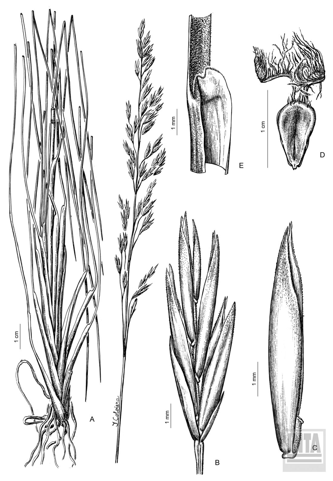 Plantas perennes, cespitosas; cañas floríferas de 50-90 cm de alto, 2-4-nodes; nudos violáceos; renuevos intravaginales, vernación conduplicada; hojas de los renuevos plegadas, erectas, alcanzando o superando ½ de la longitud de la planta, lisas, muy rígidas, ápice punzante; vainas púrpuras en la base, glabras o apenas pubescentes; lígulas de 0,5-1 mm de largo, escariosas, truncadas, ápice ciliado, auriculadas; láminas junciformes, de 1-1,5 mm de diámetro, glabras y brillantes en la superficie abaxial, pubescentes en la adaxial, ápice agudo, rígido y punzante, 11-18-nervias; trabéculas completas de esclerénquima en los nervios primarios y secundarios, esclerénquima formando un anillo continuo abaxial, nervios terciarios sin puentes de esclerénquima. Panículas de 10-20 cm de largo, lanceoladas, laxas, erectas o nutantes, raquis glabro en la parte inferior, escabroso en la superior, a menudo violáceo, al igual que las ramas, éstas suelen ser algo flexuosas y estan más o menos próximas al eje, las basales geminadas, desnudas en la parte inferior. Espiguillas de 10-18 mm de largo, elípticas, con 4-9-floras, verdosas o con tintes violáceos, segmentos de la raquilla de 1 mm de largo, escabrosos; glumas oblongo-lanceoladas, igualando o mayores que ½ del antecio contíguo, verdosas o violáceas, escabrosas en la mitad superior del dorso y en los nervios; gluma inferior de 3,5-4,5 mm de largo, 1-nervia; gluma superior de 5,5-7 mm de largo, 3(-5)-nervia; lemma de 7,5-8 mm de largo, lanceolada, violácea, margen escarioso, ápice acuminado, mútico o con un mucrón menor de 0,5 mm de largo; pálea de longitud similar o algo inferior a la de la lemma, lanceolada, 2-dentada, carenas ciliadas; anteras 3, de 3,5-4(-5) mm de largo; ovario oblongo con ápice esparcidamente piloso, pelos cortos y ralos; cariopsis de 4 mm de largo.