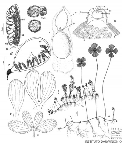 Observaciones: De acuerdo a Johnson (1986) los pedúnculos recurvados que llevan los esporocarpos, se pueden desarrollar madurando bajo tierra. Es ésta una característica única en las especies americanas y que también se conocen para taxones africanos. Se la podría interpretar como una estrategia adaptativa xeromórfica. En medio acuático los rizomas pueden alcanzar hasta 1 m de largo y los pecíolos hasta 30 cm, las pinnas son flotantes. En el período de sequía (estival) la planta crece sobre el suelo, a menudo fértil, con pecíolos de 1-2 cm y pinnas de pocos mm de largo. Se destaca que la viabilidad de sus megasporas puede llegar a 15 años y que ello permitió llevar a cabo detallados estudios sobre gametofitos, embriones y plántulas usando material de herbario (Gamerro, J. C., Nota sobre la obtención “in vitro” de esporofitos de Marsilea concinna Baker, Darwiniana 12(4): 653-656, 1963).