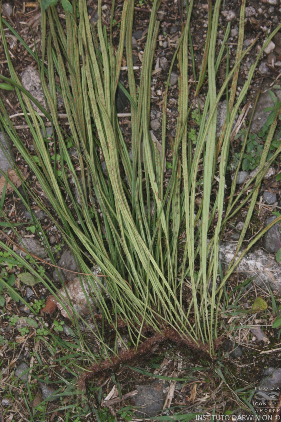 Plantas epífitas. Rizomas largamente rastreros, de 2-3(-4) mm de diámetro, verdes a verde estramíneos, con escamas ovado-lanceoladas a triangular-lanceoladas, enteras, de base suavemente escotada, castaño-grisáceas, clatradas. Frondes de 30-50(-60) cm de largo, separadas por 2-4 mm; pecíolos de 2-4(-8) cm de largo; láminas linearlanceoladas, de 0,5-1,5 cm de ancho, largamente atenuadas hacia ambos extremos, margen cartilaginoso, entero, revoluto a plano, coriáceas; cara abaxial con costa prominente, con escasas escamas esparcidas en su parte basal, ovado-deltoides, de 2 mm de largo, semejantes a las rizomáticas; venación anastomosada, poco visible, inmersa en el mesófilo; venas primarias oscuras sobre ambos lados o adaxialmente divergentes 40-60º de la costa, separados entre sí por 3- 5 mm, con 2(-3) series de aréolas entre la costa y el margen, aréolas costales trapezoidales y aréolas marginales subtriangulares, cada aréola con una venilla inclusa. Soros 2-seriados, mediales o subterminales sobre venillas inclusas, parafisos inconspicuos o ausentes. Esporangios glabros, esporas verrugadas 60- 65(-70) × 40-42 µm.