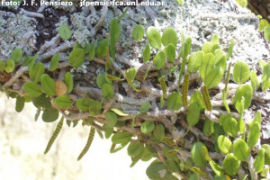 Epífitas, raramente rupícolas. Rizomas cilíndricos a aplanados dorsiventralmente, de 2-4 mm de diámetro, largamente rastreros, con numerosas ramificaciones laterales, con escamas imbricadas, basipeltadas, largamente ovadas, de 5-10 mm de largo, base redondeada, ápice largamente filiforme, el margen paucidentado, castaño, de borde blanquecino. Frondes subtrimórficas, con dos tipos de frondes estériles; pecíolos articulados a un filopodio globoso, ausentes o breves, no surcados, estramíneos, con escamas en la base, similares a las rizomáticas; láminas estériles de dos tipos, unas ovadas a ovado-lanceoladas y otras oblongas, de 1,5-6 × 1-1,8 cm, base redondeada o cordiforme, ápice obtuso o redondeado, margen entero, levemente sinuoso; láminas fértiles lineares a linear-oblongas, de 3-13 × 0,3-0,7 cm, base decurrente, atenuada a cuneada, ápice redondeado, margen entero a levemente sinuoso, papiráceas, glabrescentes, cara abaxial con escamas filiformes, de 2-3 mm de largo, tenues, dispersas sobre la costa; venación de las láminas estériles reticulada, generalmente las aréolas adyacentes a la costa con una venilla libre inclusa y hacia el margen, con aréolas menores sin venillas internas, raramente las venas son libres; venación de las láminas fértiles representada por aréolas costales fértiles, continuando hacia el margen venillas libres. Soros circulares, sobre venillas libres o en el punto de unión de dos venillas libres o anastomosadas, dispuestos en una hilera entre la costa y el margen, levemente impresos sobre la cara adaxial. Esporas verrucosas, de 55-64 µm de diámetro ecuatorial.