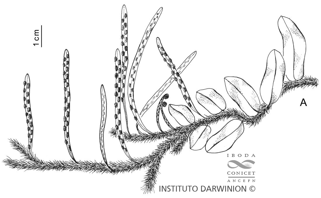Epífitas, raramente rupícolas. Rizomas cilíndricos a aplanados dorsiventralmente, de 2-4 mm de diámetro, largamente rastreros, con numerosas ramificaciones laterales, con escamas imbricadas, basipeltadas, largamente ovadas, de 5-10 mm de largo, base redondeada, ápice largamente filiforme, el margen paucidentado, castaño, de borde blanquecino. Frondes subtrimórficas, con dos tipos de frondes estériles; pecíolos articulados a un filopodio globoso, ausentes o breves, no surcados, estramíneos, con escamas en la base, similares a las rizomáticas; láminas estériles de dos tipos, unas ovadas a ovado-lanceoladas y otras oblongas, de 1,5-6 × 1-1,8 cm, base redondeada o cordiforme, ápice obtuso o redondeado, margen entero, levemente sinuoso; láminas fértiles lineares a linear-oblongas, de 3-13 × 0,3-0,7 cm, base decurrente, atenuada a cuneada, ápice redondeado, margen entero a levemente sinuoso, papiráceas, glabrescentes, cara abaxial con escamas filiformes, de 2-3 mm de largo, tenues, dispersas sobre la costa; venación de las láminas estériles reticulada, generalmente las aréolas adyacentes a la costa con una venilla libre inclusa y hacia el margen, con aréolas menores sin venillas internas, raramente las venas son libres; venación de las láminas fértiles representada por aréolas costales fértiles, continuando hacia el margen venillas libres. Soros circulares, sobre venillas libres o en el punto de unión de dos venillas libres o anastomosadas, dispuestos en una hilera entre la costa y el margen, levemente impresos sobre la cara adaxial. Esporas verrucosas, de 55-64 µm de diámetro ecuatorial.