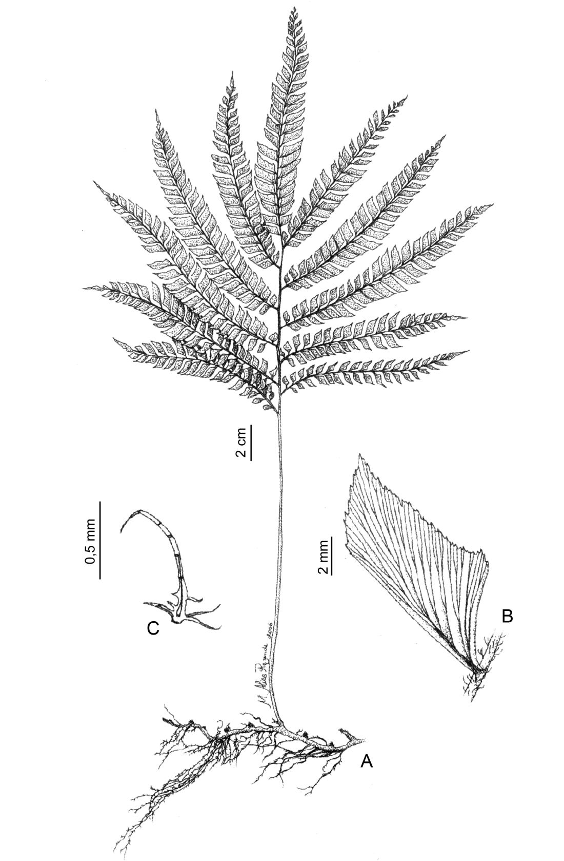 Plantas terrestres. Rizomas largamente rastreros, con escamas rizomáticas con margen entero y base marcadamente ciliadas. Frondes de 50-70 cm de largo, distanciadas hasta 1 cm; pecíolos de 1,2-1,6 mm de diámetro, tan largos como la lámina o la mitad de ella, con sección transversal del xilema en forma de pinza en la zona distal; láminas 3-4 pinnadas, de 18-30 cm de largo y contorno deltoideo; raquis rectos; peciólulos de 0,3-0,6 mm de largo; pecíolos, raquis y peciólulos con escamas semejantes a las rizomáticas; pínnulas de 1,3-2 × 0,3-0,7 cm, subdimidiadas con margen abaxial aguzado y ascendente, la vena principal desplazada hacia el margen basiscópico y que llega hasta aproximadamente la mitad de las pínnulas, células espiculares en epi e hipofilo, el margen de las pínnulas estériles dentado, finalizando las venas en los dientes. Pseudoindusios en número de 3 a 6 por pínnula, ubicados en el margen acroscópico, de contorno cuadrangular u orbicular y margen basal deprimido o recto, con células espiculares en epifilo. Soros 4 a 8 por pseudoindusio. Esporas triangulares a triquetras, de 32 × 28 µm, amarillas, con perisporio granular.