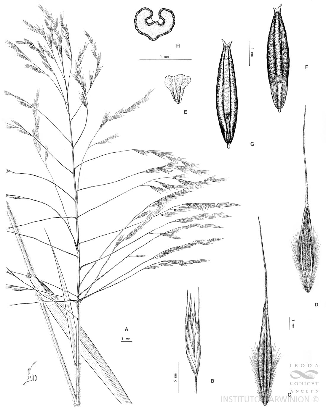 Plantas perennes, rizomatosas, de 0,80-2(-3) m de alto, robustas, ramificadas en la base; nudos glabros; vainas más cortas que los internodios, escabrosas, a menudo pilosas en el cuello; lígulas membranáceas, bordes erosos, de 1-2 mm de largo; láminas planas de 8-30 cm x 5-25 mm, escabrosas en el margen y en la cara adaxial, lisas en la cara abaxial, ralamente pilosas en ambas superficies. Inflorescencia amplia, erguida o nutante, de 10-35 cm de largo, las ramas desnudas en su ½-? inferior, las inferiores hasta de 20 cm de largo, gráciles, simples, raro ramificadas; axila de las ramas glabras. Espiguillas 4-7-floras de 8-10 mm de largo (excluidas las aristas), adosadas a las ramas, sostenidas por los pedicelos de 2-6 mm de largo; callo piloso; raquilla glabra; glumas agudas o subotusas, quillas escabrosas; gluma inferior 1-nervia de 3-5 mm de largo; gluma superior 3-5-nervia, de 4-5 mm de largo; lemma de 6-7 mm de largo, 3-nervia, nervios laterales aproximados al margen, pilosos hasta cerca del ápice, nervio medio piloso en su ½ inferior, aristada, arista apical escabrosa, de 2-7 mm de largo; pálea de igual largo que su lemma o poco menor que ella, los márgenes rala a densamente pilosos; anteras de 1-1,5 mm de largo; cariopsis castaño oscuro, libre entre las glumelas, surcada, de 3-4 mm de largo; mácula embrional ¼-? de su largo, restos de los estilos en el ápice.