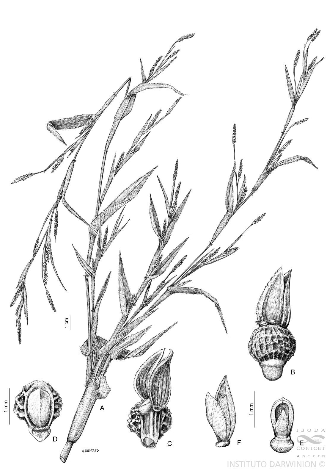 A. Caña florífera. B. Artejo del raquis con un par de espiguillas, vista dorsal. C. Artejo del raquis con un par de espiguillas, vista ventral. D. Espiguilla basal perfecta, vista dorsal. E. Gluma superior, vista ventral y antecio fértil. F. Lemma estéril y antecio de la espiguilla superior pedicelada