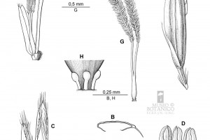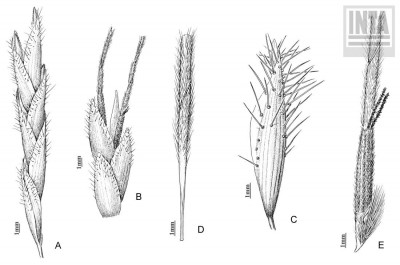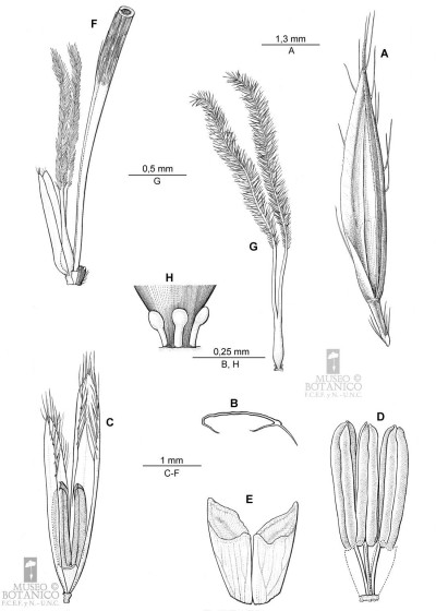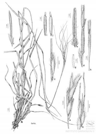 Plantas perennes, de 0,50-1,50 m de alto, cespitosas, erguidas, rizomatosas; cañas ramificadas en los nudos superiores, comprimidas, iridáceas, más o menos glaucas; entrenudos 3-7, de 2-10 cm de largo, comprimidos, huecos, glabros; nudos comprimidos, castaño-oscuro, cortamente pilosos a glabros; vainas más largas que los entrenudos, de 7-12 cm de largo, comprimidas, glabras, carinadas; lígulas membranáceo-pestañosas, de 1 mm de largo, truncadas; láminas linear-lanceoladas, de 10-35 cm x 4-7 mm, predominantemente basales, planas, verdes a ferrugíneas, glabras, los márgenes basales con pelos tuberculados, base redondeada y ápice agudo. Inflorescencias terminales y axilares similares, naciendo en los nudos superiores de las cañas floríferas, exertas o parcialmente incluidas en las vainas foliares, formadas por un racimo solitario; racimos espiciformes, de 3-8 cm de largo (excluyendo las aristas); raquis de los racimos articulado, frágil en la porción superior, separándose fácilmente de la porción inferior; espiguillas en pares, una sésil y la restante pedicelada; los pares basales del racimo homomórfos y homógamos, los pares superiores heteromorfos y heterógamos. Espiguillas homomórfas en la parte inferior del racimo dorsiventralmente comprimidas; glumas 2, glabras o esparcidamente pilosa, con pelos blanquecinos, de base tuberculada; gluma inferior de 7-10 mm de largo coriácea, mútica, bicarinada, asimétrica, 9-11 nervia; gluma superior tan larga o mayor que la gluma inferior, membranácea, carinada, de ápice agudo, ciliado en el ápice, 3-nervia; lemma inferior hialina; lemma superior hialina; estambres 3 o ausentes; espiguilla heteromorfa sésil dispuesta en la porción distal del racimo perfecta, cilíndrica, con un callo basal de 2,5 mm de largo, pungente, piloso; gluma inferior tubulosa, con los márgenes cubriendo parcialmente la gluma superior, coriácea, hirsuta, castaño-oscura, obtusa, plurinervia; gluma superior angosta, coriácea, con un reborde a lo largo del dorso, éste cortamente piloso, los márgenes lustrosos, glabros; lemma inferior hialina, ciliolada en el ápice; pálea inferior ausente; lemma superior angosta en la base terminando en una arista hasta de 3 cm de largo, retorcida, geniculada, antrorso-pilosa hacia la porción basal, luego glabra, escabriúscula hacia el ápice; pálea superior ausente; lodículas 2, truncadas; estambres 3 o vestigiales; estilos 2, unidos en la base, estigmas plumosos de emergencia apical; cariopsis cilindrica, 4-6,5 mm de largo; embrión un poco más de ½ del largo de la cariopsis; espiguilla heteromorfa pedicelada dispuesta en la porción distal del racimo, estaminada, dorsalmente comprimida; gluma inferior coriácea, aguda, biaquillada, con los márgenes inflexos, alados, carinas con glándulas, plurinervia; gluma superior cartilagínea, aguda, ligeramente aquillada, ciliolada hacia el ápice, 3-4 nervia; lemma inferior hialina; lemma superior hialina; pálea superior ausente; lodículas 2; estambres 3 o vestigiales.