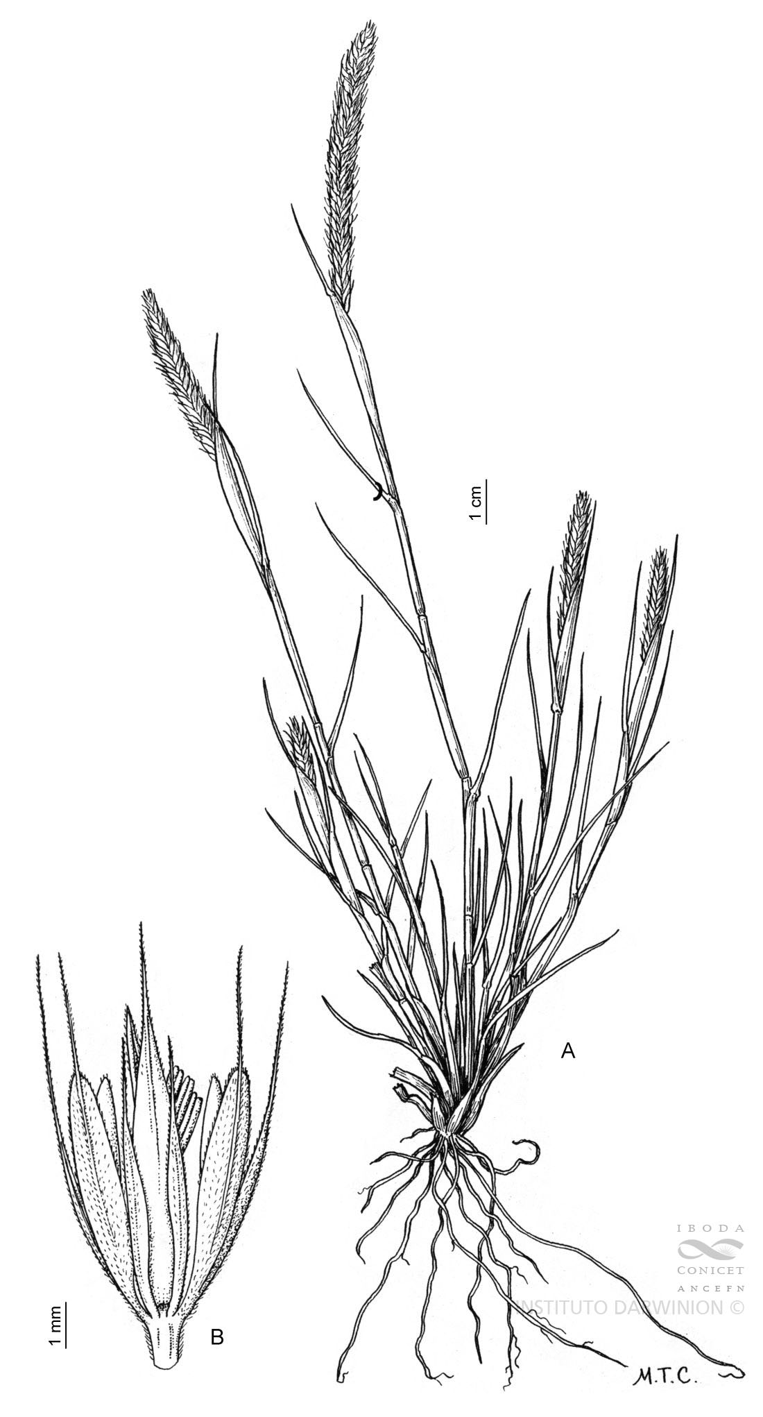 Plantas anuales, cespitosas, con cañas de (5-)20-40(-50) cm de alto, erectas a geniculadas; nudos glabros; lígulas de 0,3-2 mm de largo, truncadas; láminas de 5-80(-100) x 0,6-3 mm, normalmente planas o con los márgenes involutos, más o menos pubescentes; aurículas ausentes. Inflorescencia una espiga de (10-)20-70 x 3-5(-6) mm, exerta o semiincluida en la última vaina, pajiza a verde-amarillenta; raquis frágil. Espiguilla central sésil; glumas de (6,6-)7,5-16,5(-19,2) x 0,3-0,9 mm, aplanadas, lanceoladas hacia la base, glabrescentes a pubescentes en la parte superior; cuerpo de la lemma de 4,3-7,2(-8,6) mm de largo, glabro a pubescente, con aristas de (3-)5-11(-13) mm de largo; lodículas de 0,5-0,8 mm de largo; anteras de 0,3-1,3(-1,8) mm de largo, amarillas; prolongación de la raquilla de (1,3)2,3-4,3(5,4) mm de largo, terete. Espiguillas laterales usualmente rudimentarias y estériles, lanceoladas a agudas, glabrescentes, pediceladas, pedicelos de 1,3-2,7 mm de largo; gluma inferior de (6,7)7,9-16,6(19,3) mm de largo, aplanada basalmente, hasta de 7 mm de ancho; gluma superior de (5,6-)7,1-15,4(-16,8) x 0,2- 0,5 mm, setácea, ocasionalmente aplanada hacia la base