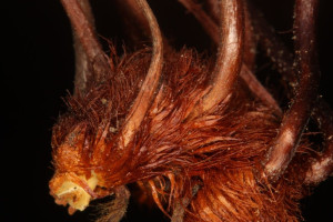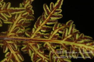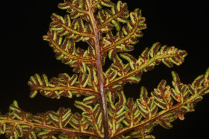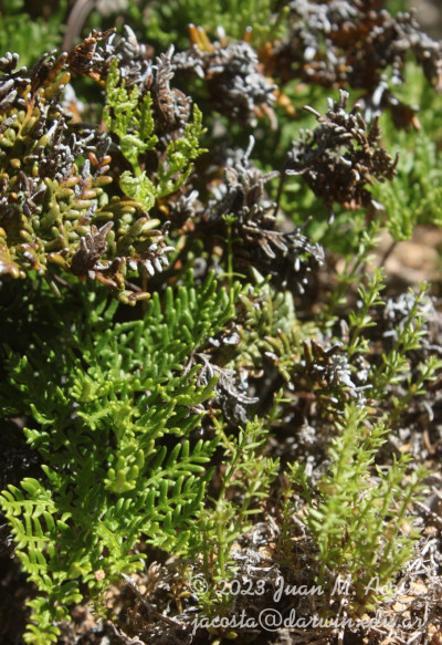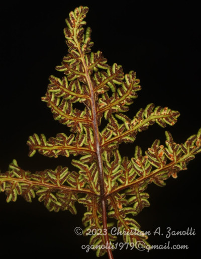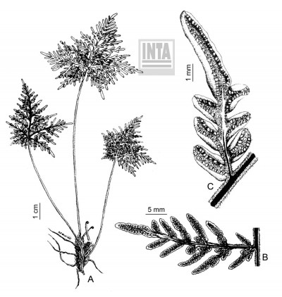 Rizomas decumbentes o rastreros, nodulosos y ramificados, con escamas subuladas, concolores, rojizas, brillantes, de margen entero. Frondes cespitosas de (6-)10-30 cm de largo; pecíolos teretes a semiteretes, levemente surcados en la porción distal, 2-4 veces más largos que la lámina, castaño rojizos, glabros; láminas de contorno pentagonal, 3-4-pinnado-pinnatífidas, coriáceas o carnosas, pilosas en la cara abaxial; raquis y costas surcados adaxialmente, con costillas verdes laterales, glabros; segmentos apicales oblongo-lobulados a lineares, margen recurvado o revoluto, cara adaxial glabra, cara abaxial con pelos simples y glandulares, paucicelares, rojizos, tiesos a crespos; venas furcadas, levemente ensanchadas en el ápice, no visibles. Pseudoindusios continuos, verdosos, de margen entero o eroso. Esporas rugulado-crestadas.
