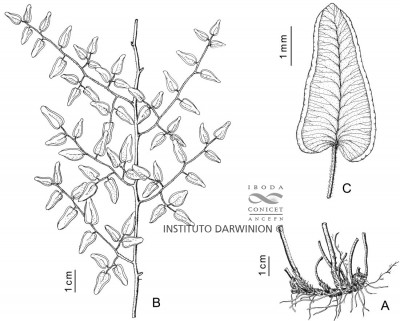 Rizomas largamente rastreros, con escamas bicolores, castaño-amarillentas a castaño-oscuras, pectinadas o erososerruladas. Frondes de 10-120 cm de largo, erectas o subescandentes, subremotas; pecíolos 1/3 de la longitud de la fronde, pajizos, escamosos en la base; láminas de contorno angostamente triangular, 2-4-pinnadas; raquis subflexuosos a flexuosos los de las pinnas, teretes a aplanados adaxialmente, pajizos a castaño-claros, cortamente pilosos a glabros; pinnas descendentes desde el raquis; pínnulas con peciólulos pilosos de 5 mm de largo, ovado-triangulares o elípticas, de 0,5-4,5 cm de largo, con base cordada a sagitada, coriáceas, esparcidamente pilosas en el envés o glabras.
