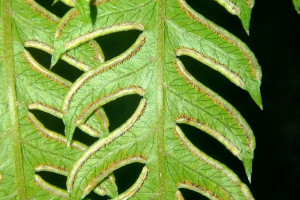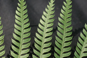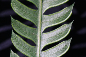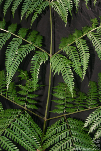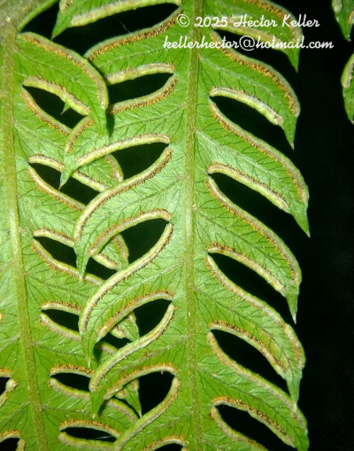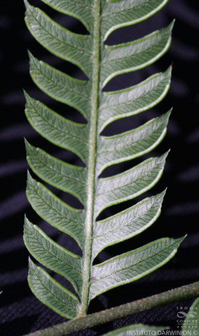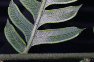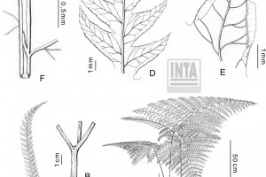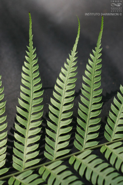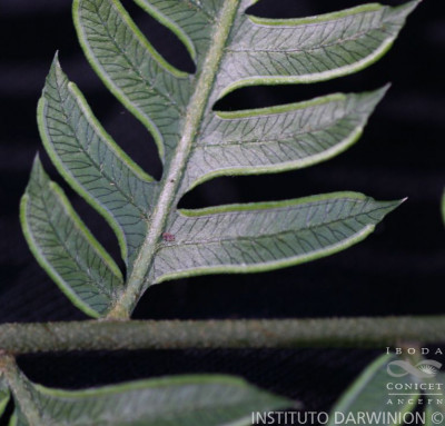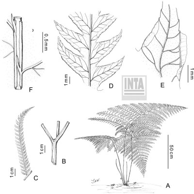 Rizomas cortamente rastreros a erectos, gruesos, de 2-8 cm de diámetro, con escamas concoloras, de 5 mm. Frondes de 40-80(-150) cm de largo, monomorfas a subdimorfas; pecíolos 1/2 o más de la longitud de la fronde, robustos, lisos, con pelos, oscuros en la base; láminas ternadas, deltadas, pedatas, pinnado-pinnatifidas, con 6-12 pares de pinnas pecioluladas a sésiles, pinnas proximales 2-3 pinnadopinnatifidas, pinnas medias 1-2 pinnado-pinnatifidas y pinnas distales pinnatífidas; segmentos subcoriáceos, glabros, de 9- 15 × 2,5-3 mm, de ápice agudo, margen aserrado, costas y cóstulas abaxialmente acanaladas y aristadas, con procesos espinosos; venación libre a 1-furcada, visible en el envés. Cenosoros con parafisos, desarrollados en casi todo el margen faltando sólo en la base y en los extremos. Pseudoindusios angostos, margen entero a veces fimbriado. Esporas rugadas, de 30-40 µm de diámetro ecuatorial.