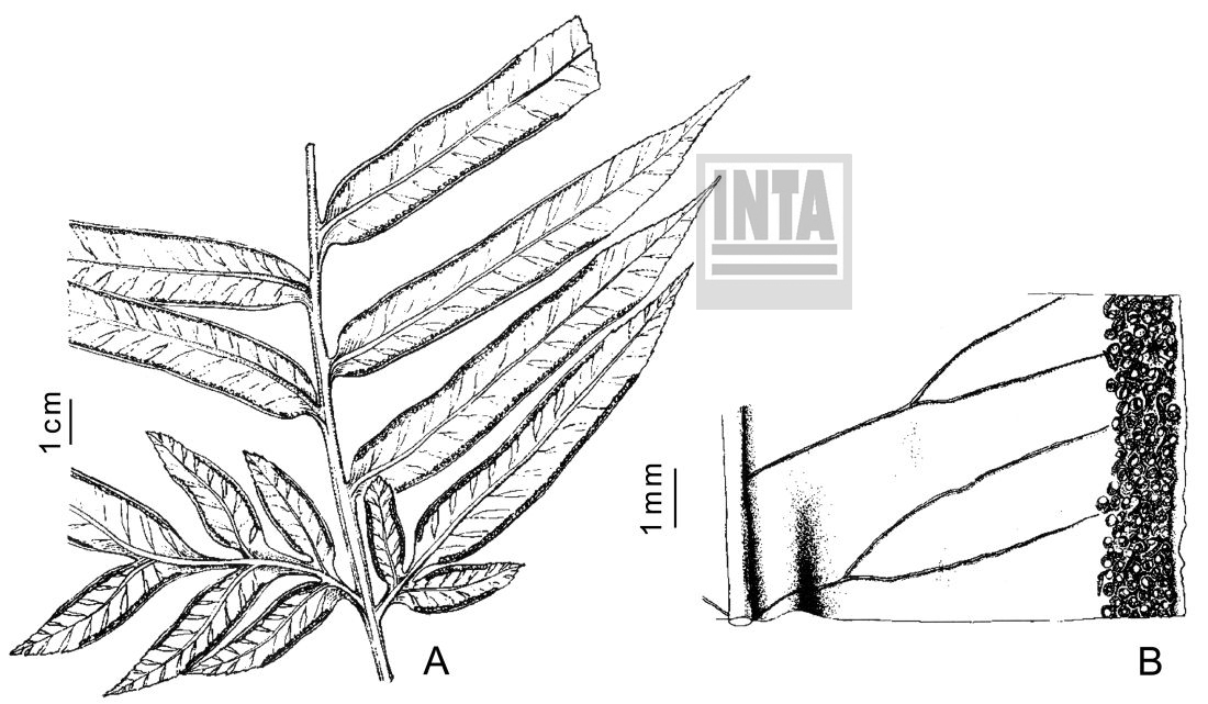A. Porción de una fronde fértil, cara abaxial. B. Detalle de un segmento fértil mostrando venación y cenosoro.