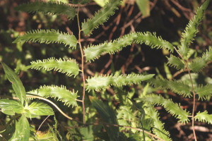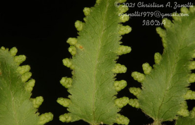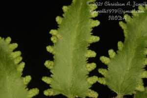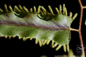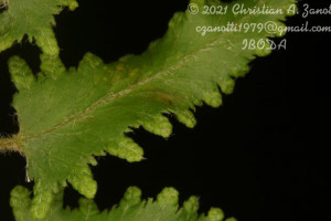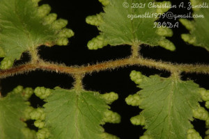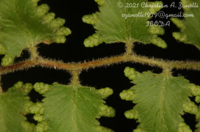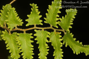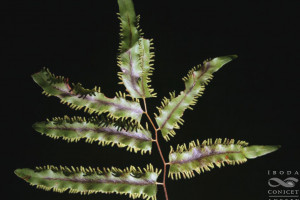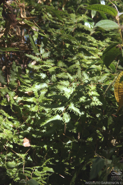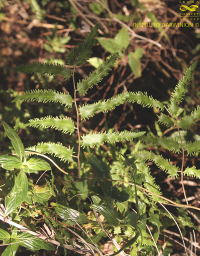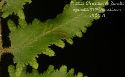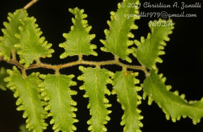 Rizomas rastreros de 3-4 mm de diámetro, con pelos negros. Frondes bipinnadas; raquis volubles, de 1-2 mm de ancho, con algunos pelos amarillentos; pínnulas cortamente pecioluladas, lanceoladas, de margen aserrado, levemente pilosas, de 3-10 × 0,5-1,5 cm, con venas libres, raramente con 1 ó 2 aurículas en la base; pínnulas fértiles levemente pilosas. Esporangios 5-12 pares, distribuidos en los lóbulos marginales, cubiertos por una estructura laminar. Esporas verrucoso-tuberculadas.