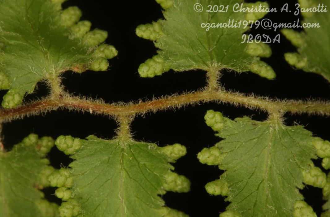 Rizomas rastreros de 3-4 mm de diámetro, con pelos negros. Frondes bipinnadas; raquis volubles, de 1-2 mm de ancho, con algunos pelos amarillentos; pínnulas cortamente pecioluladas, lanceoladas, de margen aserrado, levemente pilosas, de 3-10 × 0,5-1,5 cm, con venas libres, raramente con 1 ó 2 aurículas en la base; pínnulas fértiles levemente pilosas. Esporangios 5-12 pares, distribuidos en los lóbulos marginales, cubiertos por una estructura laminar. Esporas verrucoso-tuberculadas.