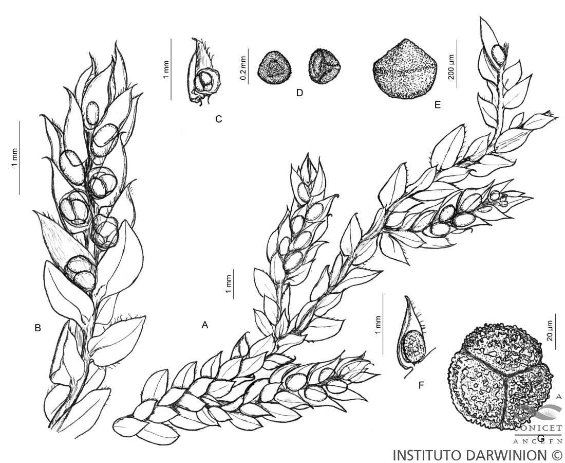 Hierbas compactas musciformes. Tallos postrados, de 1 mm de diámetro, rastreros, radicantes en los nudos, ramificación pinnada. Licofilos adpresos al tallo, subdimorfos, de márgenes hialinos y ciliados, dispuestos en 4 hileras, los laterales de 1-1,5 × 0,5 mm, con láminas ovado-elípticas, los centro-dorsales ovados, de 0,5-1 × 0,3-0,5 mm, de base cordiforme, cortamente aristados, ascendentes, imbricados sobre el tallo. Estróbilos en los extremos de las ramas laterales, de 2-6 mm de largo. Esporofilos semejantes a licofilos menores, ovado-deltoides, carinados; megasporas castañas, cara proximal verrugosa o granulada, la cara distal reticulada.