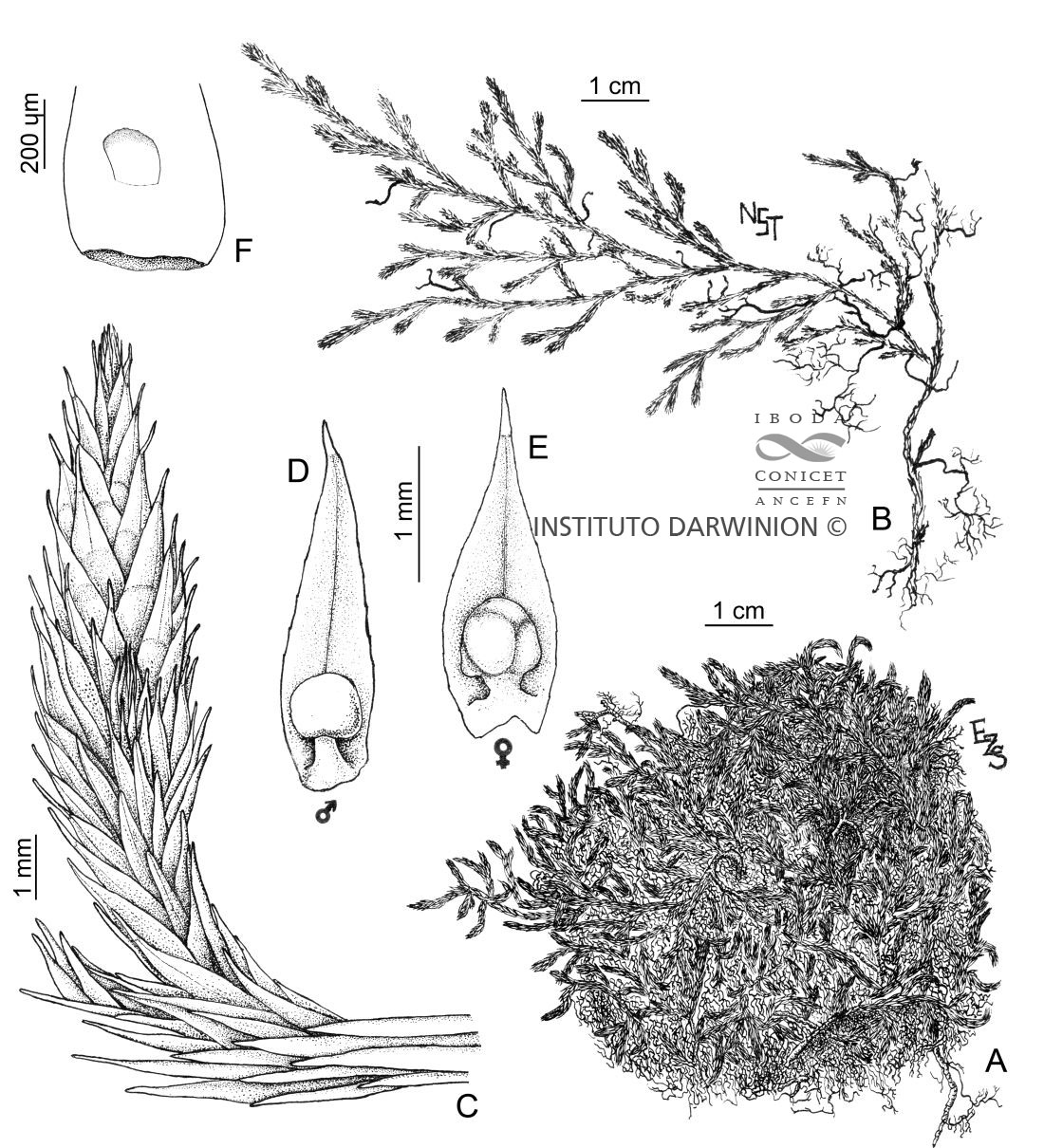 A-B. Planta. C. Estróbilo. D. Microsporofilo. E. Megasporofilo. F. Base de un trofofilo con lígula.