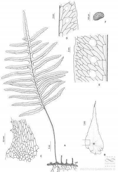 Plantas epífitas o hemiepífitas. Rizomas largamente rastreros, robustos, levemente ramificados, ca. 6 mm de diámetro, densamente escamosos; escamas pseudopeltadas, de base subcordada, atenuadas y acuminadas, ciliadas, castaño-rojizas, las escamas rizomáticas propiamente dichas de 8,5-13 × 2,5 mm y las escamas filopodiales de 11-18(-20) × 2-3,5 mm. Frondes heteroblásticas, a veces pruinosas, de alrededor de 1,35 m de largo; pecíolos de 50-58 cm de largo, castaños, sublustrosos, glabros, bases con filopodio de 10 mm de diámetro, cubiertos de escamas, pruinosos bajo ellas; láminas pinnatipartidas, de contorno ovado, cartáceas, glabras; costas canaliculadas adaxialmente, cóstulas semiteretes, epifilo con hidatodos cubiertos generalmente con plaquitas blanquecinas de CaCO3; segmentos en número variable, oblongo-lineares, dispuestos oblicuamente hacia el ápice, que es agudo, con base a veces contraída, segmentos basales ca. 22 × 1,6 cm, segmentos medios ca. 27 × 3 cm; venación reticulada, con 1 hilera de aréolas costales 10-12 veces más largas que anchas, aréolas mayores más anchas que largas, dispuestas en 2(-3) hileras, por excepción sólo en parte 1 hilera, con 2(3-4) venillas inclusas, conniventes, formando un receptáculo sorífero, aréolas marginales menores, con 1-2 venillas inclusas. Soros circulares, castaño-rojizos, 2(-3) seriados, con anillo esporangial con (11-)12-14(-15) células; hipostomio y epistomio formado por 4 células cada uno.