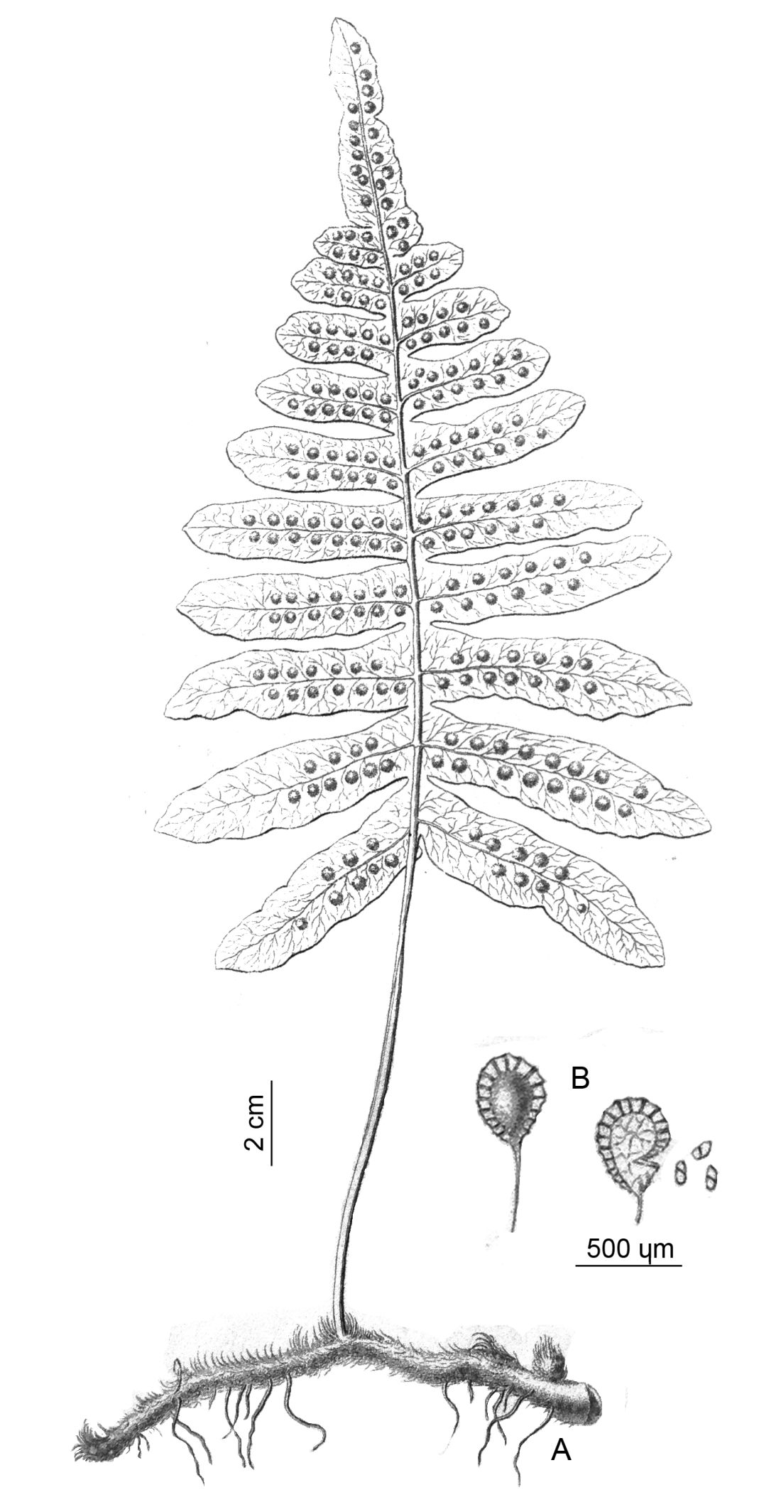 Plantas epífitas o rupícolas. Rizomas cortamente rastreros, de 3-5 mm de diámetro, castaño-oscuros, a veces glaucos, con escamas no adpresas, ovadas, ápice largamente acuminado, castañas con margen hialino, entero, con glándulas inconspicuas, clatradas. Frondes monomorfas, de 10-35 cm de largo; pecíolos de 1,5-4,5 cm de largo, estramíneos, distalmente glabros, alados adaxialmente, la base con escamas semejantes a las rizomáticas; láminas pinnatisectas, deltoides a deltoideolanceoladas, de 8-30 × 6-13 cm, cartáceas; segmentos linearoblongos, de 1,5-6,5 × 0,5-1 cm, de base atenuada, asimétrica, ápice redondeado u obtuso, margen cartilaginoso, entero a ondulado, segmentos basales orientados hacia la base, glabros, con tricomas glandulares inconspicuos sobre el raquis y las costas; venación no evidente, con 2 hileras de aréolas entre la costa y el margen. Soros en 1 hilera entre la costa y el margen, con parafisos. Esporas verrugadas, de 35-86 µm de diámetro ecuatorial.