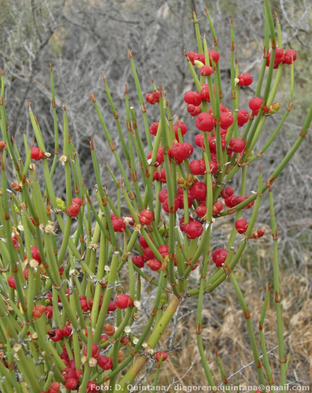 Arbustos dioicos, hasta de 2 m de alto, formando amplias matas arbustivas o subarbustivas de proyección semicircular de 2-4 m de diámetro. Ramitas jóvenes erectas, rígidas, muy gruesas, de 1,5-3 mm de diámetro. Hojas persistentes, dispuestas en ramas con verticilos foliares 3-meros y en ramas con verticilos foliares 4-meros, escindidas a la madurez, recurvadas, de 4-14 mm de largo; base foliar envainante, de longitud igual o mayor a la del apículo; bandas de tejido fibroso grueso central y bandas de tejido fibroso delgado interfoliar con igual grado de desarrollo; alas membranáceas vestigiales en la base del apículo; apículos foliares linear-agudos, aleznados. Estróbilos microsporangiados simples, sésiles, piramidales, de 7-9 mm de largo, con 9-14 verticilos de 3-4 brácteas soldadas lateralmente; microsporofilos ca. 2,7 mm de largo; microsporangios 3-7, 2-loculares. Estróbilos megasporangiados de 8-10 mm de largo; brácteas subapicales cortas con respecto a las apicales y estas últimas soldadas en la casi totalidad de su longitud, cubren a las semillas casi totalmente, cuando maduros los estróbilos son rojos, carnosos. Semillas 3 (raro 2 o 4), obovoideo-oblongoideas, de 5,8-7 × 2,7-3,8 mm, rugosas, con numerosas estrías.