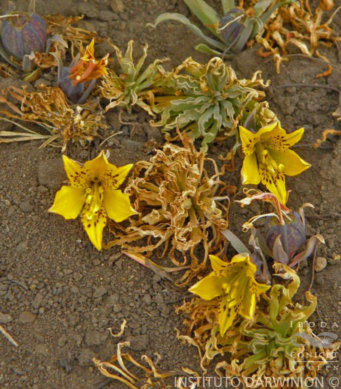 Plantas enanas de 2,5-6 cm de alto. Rizomas flexuosos (aprox. de 1,8 mm de espesor), con raíces tuberizadas de 5-6 cm x 6 mm. Tallos de 5-40 mm por encima del suelo, unifloros o rara vez bifloros. Hojas aéreas con frecuencia rosuladas, oblanceoladas, de 15-20 x 2-2,5 mm, hacia los bordes crispado-onduladas. Flor cernua o rara vez erecta, amarilla. Perigonio de 17-20 mm. Tépalos oblanceolados, unguiculados, los exteriores aprox. de 15-16 x 5 mm, los interiores algo más largos, de 16-17 x 5 mm, hacia el ápice agudos, los superiores con manchas rojizas. Estambres más cortos que el perigonio, declinados; anteras aprox. de 1,2 x 1 mm. Ovario obovoide, aprox. de 2 x 1,9 mm; estilo de la misma longitud que los estambres. Cápsula globosa aprox. de 9 mm de diámetro; semillas globosas, aprox. de 2 mm de diámetro, rugosas.