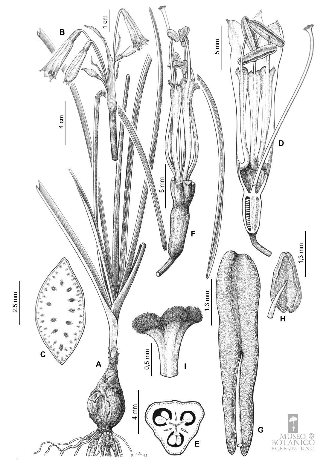 A. Planta que produzco el escapo representado en B. Ápice de escapo florífero. C. Transcorte de escapo. D. Corte longitudinal de flor. E. Trancorte de ovario con 3 lóculos y 3 nectarios. F. Flor a la que se le quito el perianto para poner en evidencia los estambres soldados. G. vista dorsal de antera húmeda antes de la dehiscencia. H. Otra antera en vista dorsal. I. Estigma