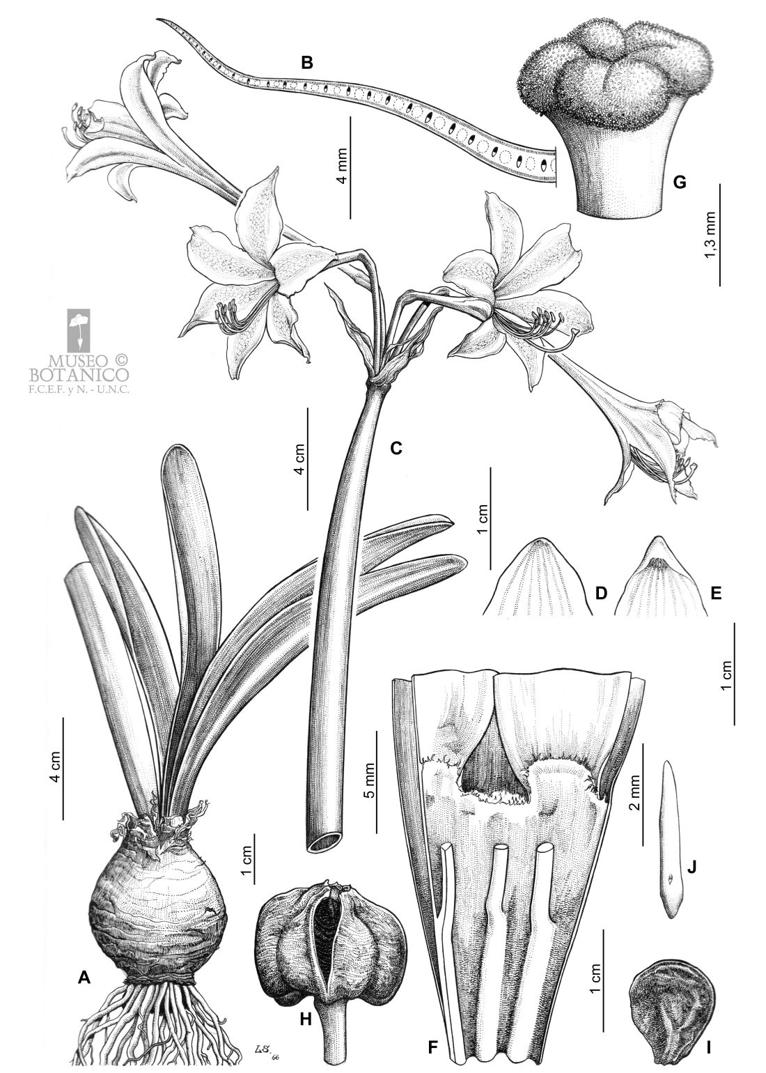 A. Planta. B. Esquema de transporte de hoja. C. Inflorescencia. D-E. Ápice de tépalos. F. Sector de flor en corte longitudinal. G. Estigma. H. Fruto deshiscente. I. Semilla, vista lateral. J. Embrión (de A. T. Hunziker 19566, fruto, semilla y embrión.