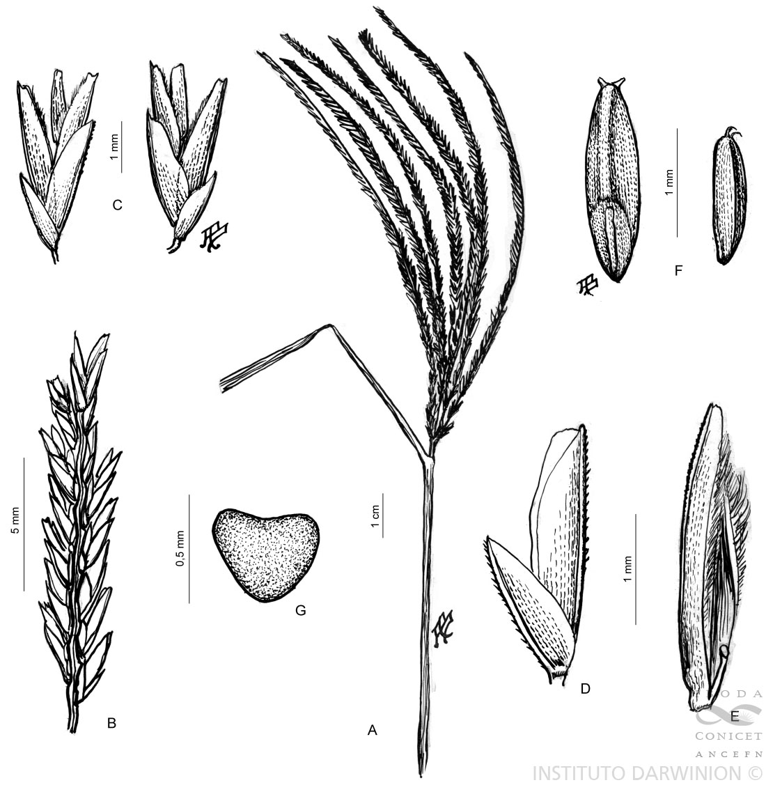 Plantas perennes, con cañas de 70-200 cm de alto, 3-4 mm de diámetro, elípticas a redondeadas, erectas, simples; entrenudos de 10-30 cm de largo, delicados, huecos; nudos glabros; vainas más largas o más cortas que los entrenudos, redondeadas, glabras; cuello verde a pajizo; ligulas de 0,5-1 mm de largo, cortamente pilosas, con largos pelos por detrás en la base de la lámina; láminas de 5-50 x 2,8-5,5 cm, caulinares, lineares, esparcidamente pilosas hacia la base de la cara adaxial a glabras o ligeramente escabrosas en la cara adaxial, planas, involutas al secarse, no desarticulando en la base, nervio medio manifiesto o no. Inflorescencia una panoja de 20-53 x 8-15 cm, exerta; ramificaciones 7 a 20, de 10-16 cm de largo, fuertemente digitadas, ascendentes a erectas, los ápices algo reflejos, firmes pero no rígidas, escabriúsculas, eje de las ramificaciones piloso. Espiguillas de 2,4-5 mm de largo, sésiles, fuertemente imbricadas a excepción de la base de las ramificaciones; antecios 3-4; callo glabro; gluma inferior de 1,3-2,6 mm de largo, membranácea, angostamente ovada, escabrosa sobre el nervio medio y ligeramente papilosa hacia los márgenes; gluma superior de 2,2-3,7 mm de largo, similar a la gluma inferior, en ocasiones ligeramente obtusa; lemma de 2,8-3,8 mm de largo, 3-nervia, cartácea, angostamente ovada a ovada, verdosa, marrón, los nervios laterales conspicuos a inconspicuos, extendidos hasta los márgenes, superfice esparcidamente serícea entre los nervios laterales, el ápice agudo a ligeramente obtuso y bífido, generalmente con un mucrón de menos de 0,5 mm de largo; pálea membranácea, casi tan larga como la lemma, angostamente elíptica a angostamente ovada, escabriúscula entre los nervios, el ápice agudo a ligeramente bífido; estambre aparentemente 1, antera de 0,4-0,6 mm de largo, amarilla o púrpura; cariopsis de 0,9-1,9 x 0,3-0,4 mm, angostamente elipsoidea, obtriangular en vista transversal, ligeramente rugoso; hilo reducido, pericarpio ligeramente adnato al endosperma.