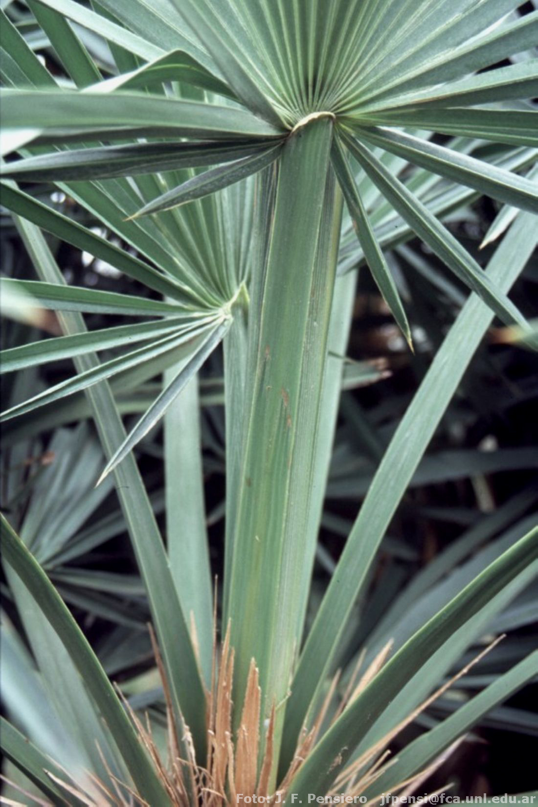Arbusto de 1-4 m, rara vez 6 m o más de alto, mono- o pluricaules formando matas duras, espinosas casi indestructibles; hojas en abanico, rígidas, verde-grisáceas a plateadas, persistentes en posición péndula largo tiempo después de secas, formando “pollera” que cubre el estípite, pero a menudo destruida por agentes externos (fuego, animales); vainas fibrosas envolventes, con espinas poderosas de 10-15 cm de largo y base dilacerada, pecíolo de 30-50 cm de largo, rígido, aplanado y marginado, sin aguijones; lámina plegada ca. 23-75 cm de largo, con 11-29 segmentos irradiantes, lineales, cóncavos hacia arriba, unidos en la mitad de su longitud, o libres hasta casi la base, de ápice brevemente bilobulado y con dos mucrones espinosos, segmentos laterales gradualmente menores. Panoja muy ramosa, bracteada, blanco-amarillenta en antesis, menor que las hojas, con espádice hasta 50 cm de largo. Flores pequeñas, cáliz y corola de 3-5 mm de largo, estambres 6, exertos. Baya de 1,5-2,2 cm de diámetro, inmadura verde-oscuro, madura amarilla, astringente, irritante al paladar, globosa, uniseminada, pericarpo delgado.
