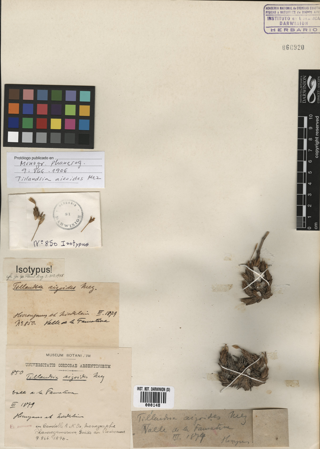 Material Tipo: Argentina. La Rioja. Dpto. Famatina. Valle de Famatina, Mar 1879, G. Hieronymus & G. Niederlein 850 (lectotipo, B 10 0247107, Foto Serie Field Mus. 11475, designado como "holotype" por L. B. Smith & R. J. Downs, Fl. Neotrop. Monogr. 14(2): 881. 1977; isolectotipos, CORD 00002214, SI 000148).