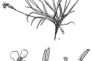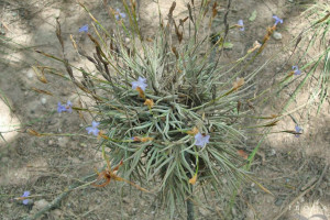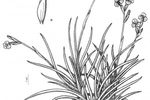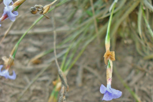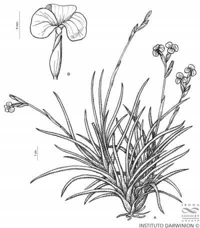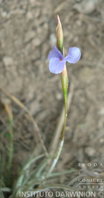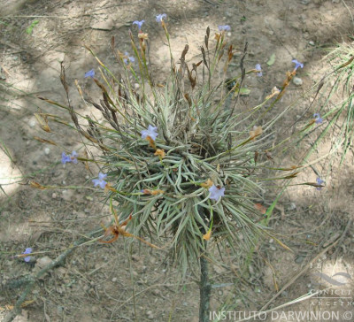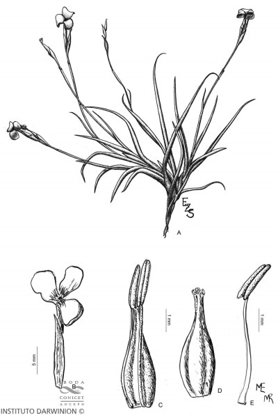 Planta cespitosa, en flor ca. 10-20 cm de altura, formando ovillos. Hojas ca. 5-7 x 0,1-0,2 cm, dísticas, subuladas, involutas, densamente lepidotas, grisáceas. Escapo floral, sobrepasando las hojas ca. de 9 cm, lepidoto en la parte basal, con 1-2 brácteas remotas, más cortas que los entrenudos, envainadoras, estriadas, la superior glabra, la inferior usualmente lepidota. Inflorescencia en espiga dística, glabra, con 2-4 flores, ca. 2-3 cm de largo, raquis muy delgado, subflexuoso, glabro. Flores erectas adpresas al raquis, subremotas, cortamente pediceladas; brácteas florales grisáceas, iguales o apenas más largas que los entrenudos, ovado-elípticas, agudas, de 9-12 mm, inferiores subglabras, superiores glabras. Sépalos grisáceos, de 8-10 x 2-3 mm, subelípticos, unidos en la base, glabros. Pétalos liláceos o violáceos, de 15 mm, con uña angosta, acanalada, limbo elíptico o obovado, 0,5 cm de ancho. Estilo más corto que el ovario. Estambres incluidos, de 0,5 cm. Cápsula subcilíndrica, de 2 cm, rostrada.