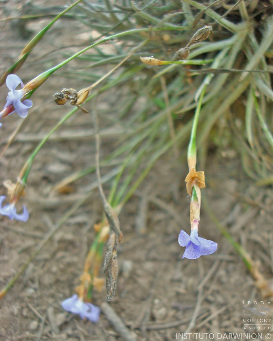 Planta cespitosa, en flor ca. 10-20 cm de altura, formando ovillos. Hojas ca. 5-7 x 0,1-0,2 cm, dísticas, subuladas, involutas, densamente lepidotas, grisáceas. Escapo floral, sobrepasando las hojas ca. de 9 cm, lepidoto en la parte basal, con 1-2 brácteas remotas, más cortas que los entrenudos, envainadoras, estriadas, la superior glabra, la inferior usualmente lepidota. Inflorescencia en espiga dística, glabra, con 2-4 flores, ca. 2-3 cm de largo, raquis muy delgado, subflexuoso, glabro. Flores erectas adpresas al raquis, subremotas, cortamente pediceladas; brácteas florales grisáceas, iguales o apenas más largas que los entrenudos, ovado-elípticas, agudas, de 9-12 mm, inferiores subglabras, superiores glabras. Sépalos grisáceos, de 8-10 x 2-3 mm, subelípticos, unidos en la base, glabros. Pétalos liláceos o violáceos, de 15 mm, con uña angosta, acanalada, limbo elíptico o obovado, 0,5 cm de ancho. Estilo más corto que el ovario. Estambres incluidos, de 0,5 cm. Cápsula subcilíndrica, de 2 cm, rostrada.