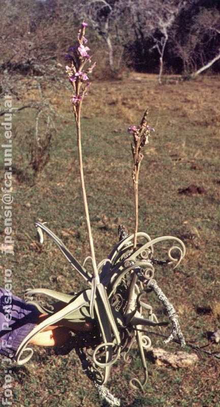 Planta caulescente, de más de 50 cm de altura, tallo curvo. Hojas de 15-25(30) x 1-2 cm, polísticas, adpresas o subadpresas al tallo, recurvadas, crasas, acintadas, convolutas, acanaladas, con punta circinal, lepidotas, grisáceas. Escapos erectos, glabros, con brácteas imbricadas, Inflorescencia compuesta ca. 20 cm de largo, laxa, 4-12 espigas dísticas, generalmente con más de 5 flores cada una. Flores subsésiles, recurvadas, perfumadas. Bracteas florales rectas, ovadas o elípticas, de 1,5 x 0,8 cm, cartáceas, lepidotas. Sépalos de 14 x 07 mm, unidos en la base, ovado-triangulares, subobtusos, acartuchados, cartáceos, glabros o apenas lepidotos, con numerosos nervios. Pétalos de 23-25 mm de largo, espatulados, con uña ca. 11 x 2,5 mm, acanalada, blanca, limbo de 13-16 mm de ancho, suborbicular, azul-violáceo. Estambres incluidos, adosados a los pétalos, ca. 12 mm de largo. Estilo más corto que el ovario.