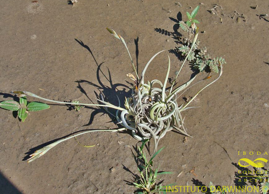 Hierba gregaria, de 10-30 cm de alto. Tallo de 4-10 cm de largo, poco ramificado. Hojas dísticas, surcadas, arqueadas, de 3,5-7 x 0,3-0,5 cm de largo. Vaina suborbicular o reniforme, lepidota en la 1/2 distal. Escapo de 2,5-7 cm de largo, lepidoto o glabrescente (por caducidad de los tricomas), 1 bracteado. Bráctea del escapo foliosa, de vaina más larga que el limbo, lepidota. Inflorescencia de 3-5 cm long.de largo, con 2-5 flores sésiles. Brácteas florales ovadas, agudas, 3-5-nervadas, tan largas como los sépalos o levemente más cortas. Flores adpresas al raquis. Sépalos lanceolados, de 8-10 mm de largo long., 5-9-nervados, lepidotos. Corola blanco-amarillenta, pétalos estrechos, de 20-25 mm longde largo. Estilo más corto que el ovario