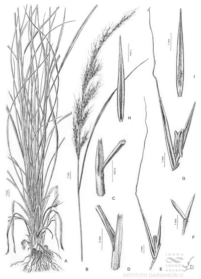 Plantas perennes, densamente cespitosas; cañas de 40-100 cm de alto, erectas y rígidas, glabras a escabriúsculas en su porción basal, nudos teretes, usualmente un nudo por caña, entrenudos generalmente glabros; vainas de 2-30 cm de largo, más largas que los entrenudos, redondeadas cerca de la base, glabras a escabriúsculas; lígulas de (1-)3-6(-8) mm de largo, membranáceas, a menudo laceradas, más firmes debajo, fuertemente decurrentes, ápice obtuso a agudo; láminas planas o involutas, no falcadas, abaxialmente glabras a escabriúsculas, adaxialmente escabriúsculas a hírtulas, de 12-35 cm x 1-3 mm. Inflorescencia una panoja débilmente contraída a abierta y laxa, de (4-)10-35 x (2-)3-5(-15) cm, erecta, rojiza a purpúrea; ramificaciones primarias de 0,4-10 cm de largo, algunas veces capilares, ascendentes y abiertas hasta en ángulos de 80° con respecto al raquis; pedicelos de 1-10 mm de largo, capilares, patentes, flexuosos, generalmente más largos que las espiguillas. Espiguillas rojizo-purpúreas, de 3,5-5 mm de largo; glumas de 1-1,7(-2) mm de largo, menos de ½ del largo del antecio, similares, 1-nervias, sin arista, ápice obtuso a subagudo, algunas veces hírtulas, raramente mucronadas; lemma de 3,5-5 mm de largo, estrechamente lanceolada, de ápice acuminado, escabriúscula a escabrosa, purpúrea; callo con tricomas hasta de 0,5 mm de largo, aristada, arista de (8-)10-22 mm de largo, flexuosa; pálea de 3,5-5 mm de largo, estrechamente lanceolada, purpúrea, escabriúscula, ápice acuminado; anteras de 1,7-2,3 mm de largo, rojizo-purpúreas; cariopsis fusiforme, café-rojiza, de 2-3,5 mm de largo.