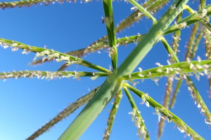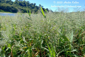 Plantas perennes, acuáticas; cañas decumbentes, hasta de 2 m de largo; cañas floríferas con la porción superior ascendente, de 9-60 cm de alto; entrenudos de 3-20 cm y 3-10 mm de diámetro, glabros, huecos; nudos pubescentes, castaños; vainas superpuestas hacia la porción superior de las cañas floríferas, flojas, las inferiores infladas, más o menos esponjosas; vainas glabras a esparcidamente papiloso-hirsutas, verdosas o con tintes violáceos a violáceas, con los márgenes esparcidamente ciliados; aurículas presentes, cortamente pilosas en el ápice, de 2-4(-8) mm de largo; lígulas de 1,6-2(-3,5) mm de largo, castañas, de ápice denticulado, lacerado, cara adaxial lustrosa, la abaxial cortamente pilosa, los márgenes continuándose con las aurículas; cuello glabro, castaño a negruzco, glabro; láminas lineares, de (2-)4-27(-40) cm x (2-)4-18(-25) mm, ascendentes, glabras a cortamente pilosas en toda la superficie, lisas a escabriúsculas, de base atenuada y ápice agudo, los márgenes lisos a escabrosos, los inferiores en ocasiones largamente ciliados, con pelos papilosos. Inflorescencias terminales de (3-)5-20(-26) x (2-)4-8 cm; pedúnculos subincluidos en las vainas foliares a exertos, hasta de 25 cm de largo; eje principal de 4-13 cm de largo, anguloso, glabro, liso a escabroso; pulvínulos glabros; racimos (8-)24-65, los inferiores verticilados, luego subopuestos a alternos, ascendentes, divergentes; raquis de los racimos de 2-6 cm x 1,5-2,5 mm, verdoso, liso a escabroso, tardíamente caedizo, terminando en una prolongación estéril, de 3-7 mm de largo; espiguillas dispuestas en (1-)2 series sobre un lado del raquis, imbricadas, cubiertas por los márgenes del raquis; pedicelos breves, de 0,2 mm de largo, escabriúsculos. Espiguillas elipsoides, de 1,2-2 x 0,5-0,8 mm, plano-convexas, de ápice largamente agudo a acuminado, glabras a híspidas, con pelos de ápice globoso, ca. 0,15-1(-2) mm de largo; gluma superior y lemma inferior subiguales, hialinas, 0,2-0,3 mm más largas que el antecio superior; gluma superior y lemma inferior tan largas como la espiguilla, 2-nervias, con los nervios próximos a los márgenes, finamente papilosas; pálea inferior reducida; flor inferior ausente; antecio superior elipsoide, de 1-1,7 x 0,5 mm, cartilaginoso, finamente papiloso; lodículas de 0,2 mm de largo; estambres, 3, anteras de 0,8-0,9 mm de largo; cariopsis elipsoide, de 0,6-0,8 x 0,4 mm, pálida; hilo punctiforme; embrión ? o poco más del largo de la cariopsis.