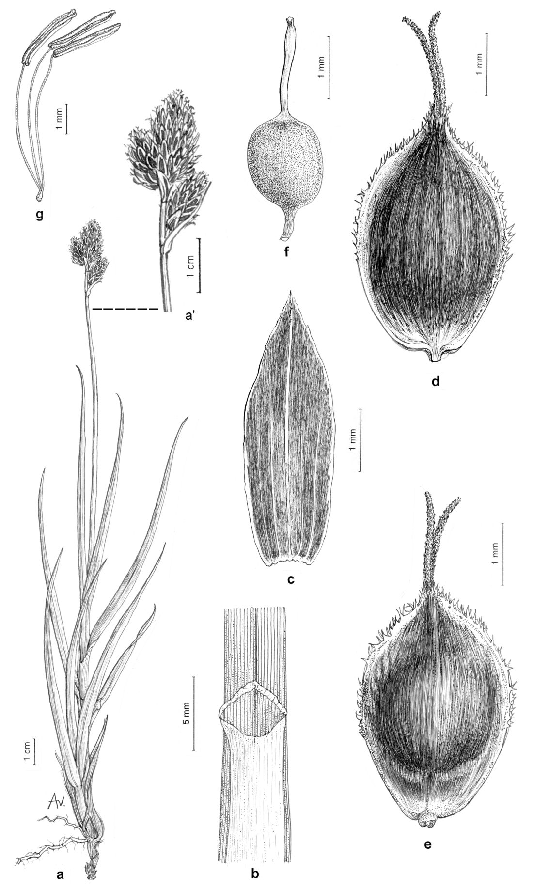 A. Planta. A'. Detalle de la inflorescecnia. B. Base de la hoja con lígula. C. Gluma del utrículo. D. Utrículo, vista dorsal. E. Utrículo, vista ventral. F. Aquenio. G. Flor estaminada